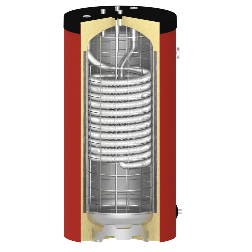 The built-in corrugated stainless steel pipe separates the drinking water from the heating water and also serves as a high-performance heat exchanger. This combines the advantages of a buffer storage tank with those of an instantaneous water heater.