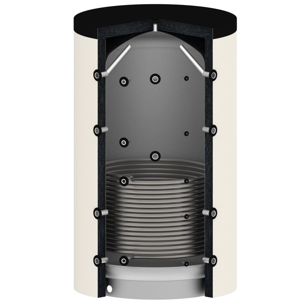 Accumulo inerziale di qualità superiore per le esigenze più elevate di accumulo di calore e di efficienza. Soprattutto quando si utilizzano generatori di calore che raggiungono un'efficienza ottimale solo a pieno carico (ad esempio, molte caldaie a combustibile solido). Durante il funzionamento del generatore di calore, viene generata una quantità di calore superiore all'utenza. Il calore in eccesso riscalda l'acqua dell'accumulo inerziale e viene così immagazzinato. Il bollitore tampone OEG è adatto come accumulatore di caricamento stratificato per impianti solari, pompe di calore, caldaie a biomassa, caldaie a pellet e può essere utilizzato anche nel teleriscaldamento. Lo scambiatore di calore a tubo liscio aggiuntivo consente di integrare un generatore di calore supplementare e di immettere la sua energia nell'accumulo inerziale.