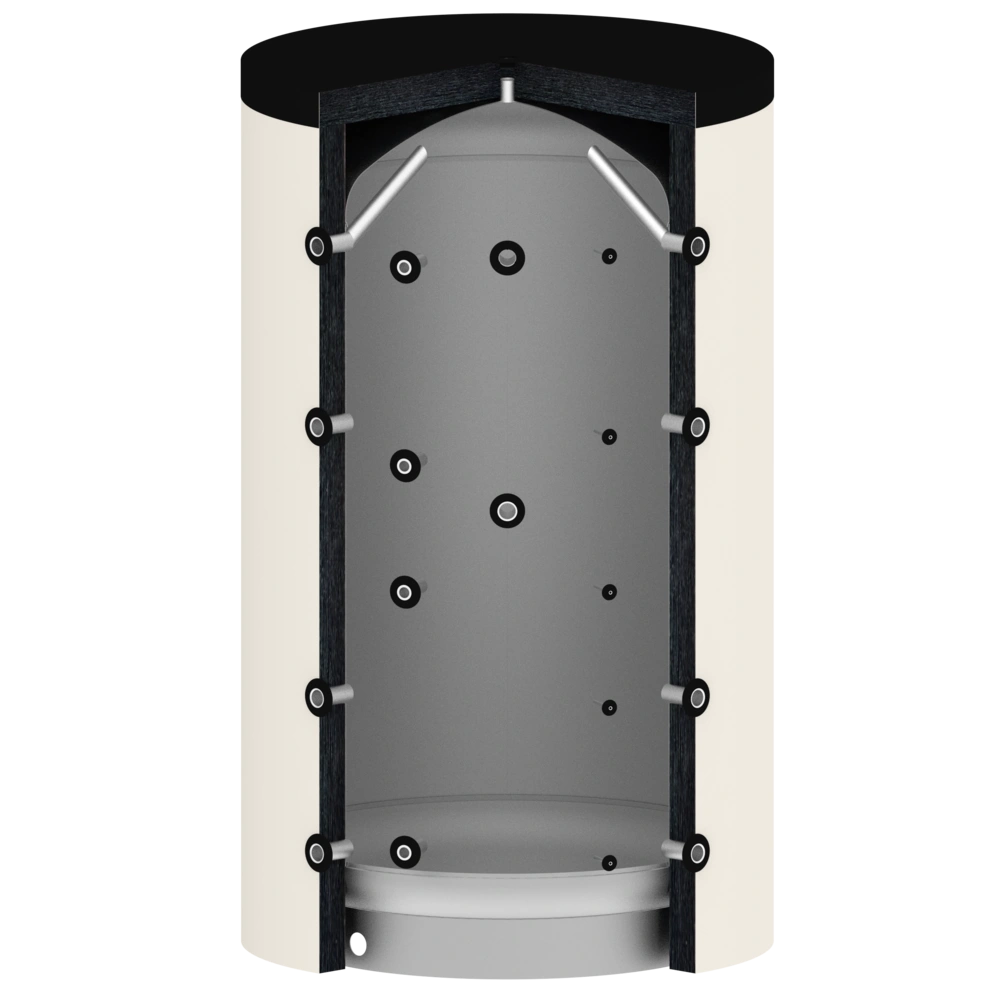 Accumulo inerziale di qualità superiore per le massime esigenze di accumulo di calore e di efficienza. Grazie al guscio di coibentazione altamente efficiente, la dispersione termica è notevolmente ridotta rispetto ai serbatoi standard. Il compito dell'accumulo inerziale è quello di compensare la differenza tra il calore generato e quello consumato. In questo modo, i generatori di calore possono funzionare in modo più indipendente dall'utenza.
