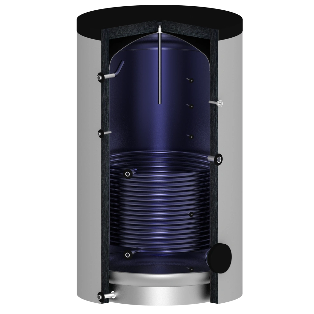 La superficie interna del bollitore ha una finitura smaltata di alta qualità. La superficie dello scambiatore di calore di dimensioni generose, che si estende fino al pavimento, garantisce un ottimo scambio di calore. Una flangia d'ispezione laterale consente una facile manutenzione e pulizia del bollitore e, se necessario, può essere equipaggiato con un manicotto per la resistenza. L'impareggiabile isolamento sottovuoto OEG dei cilindri ha perdite di calore significativamente inferiori rispetto al guscio di coibentazione dei cilindri standard presenti sul mercato.