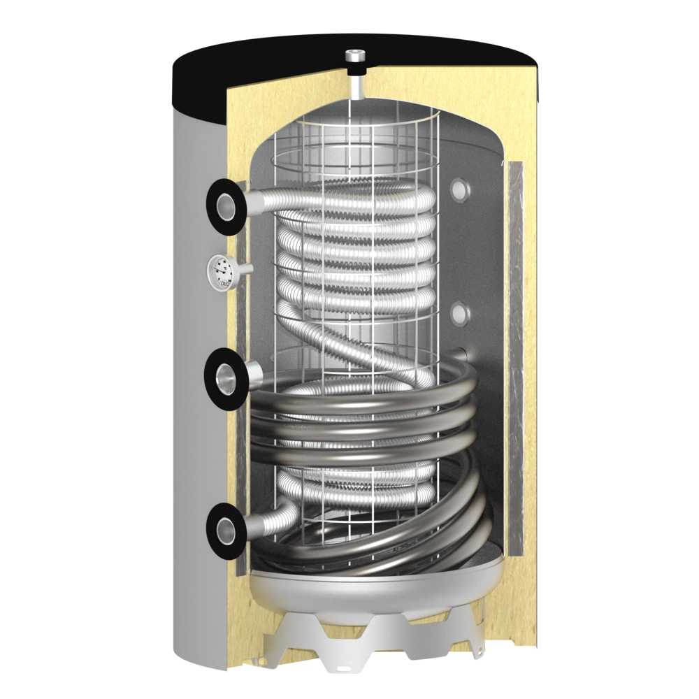 Deze boiler is een hygiëne boiler. Het tapwater wordt volgens het principe van een doorstroomverwarmer verwarmd, dat gebeurt in de RVS buis. Het CV water zit in de boiler, om de RVS spiraal heen. Het CV water kan door de extra warmtewisselaar met behulp van solar verwarmd worden.