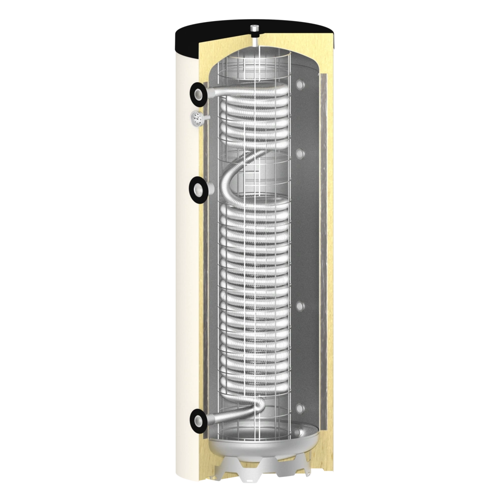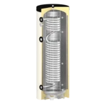 Het opslagvat is gevuld met verwarmingswater (in een gesloten systeem) het tapwater wordt via de RVS wisselaar volgens het doorstroomprincipe verwarmd.