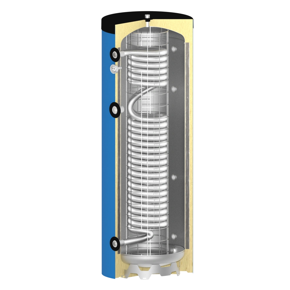 Deze boiler is een verswaterboiler. Het hele vat is gevuld met verwarmingswater. Alleen de rvs-warmtewissellaar is voor drinkwater geschikt.
