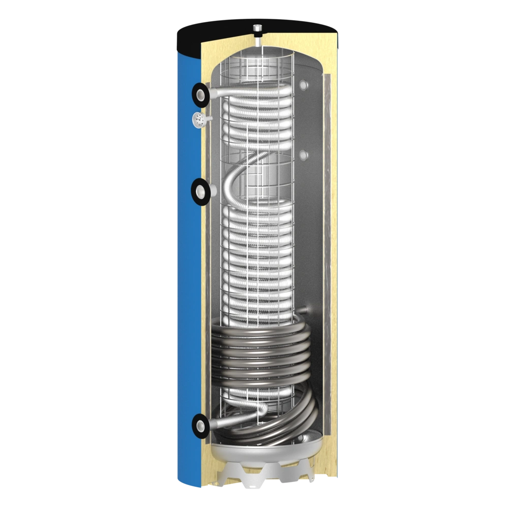 Frage zum 200l Frischwasserspeicher 516008262 mit einem Glattrohrwärmetauscher: Das Bild zeigt einen Glattwärmetauscher. In den technischen Daten auf S.16 gibt es C und E Zusatzwärmetauscher 4,2l oben und einen J und M Zusatzwärmetauscher 7,5l unten. Was ist richtig? Gibt es auch eine 90 Grad Variante vom 200l Modell?