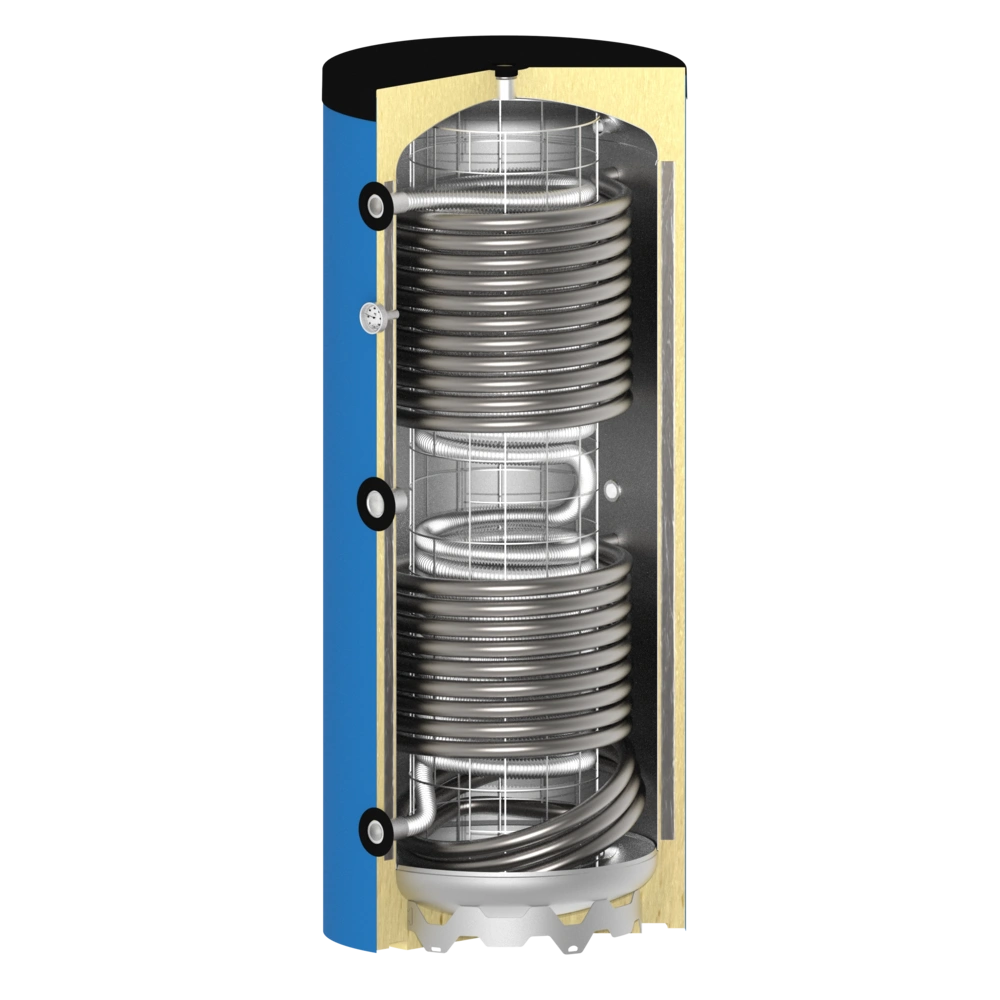 Il y a deux échangeurs thermiques en tube lisse pour le raccordement de différents générateurs de chaleur. Le troisième échangeur thermique est constitué d'un tube ondulé en acier inoxydable et est prévu pour le passage de l'eau d'appoint. L'eau sanitaire y est chauffée de manière hygiénique, comme dans un chauffe-eau instantané.
