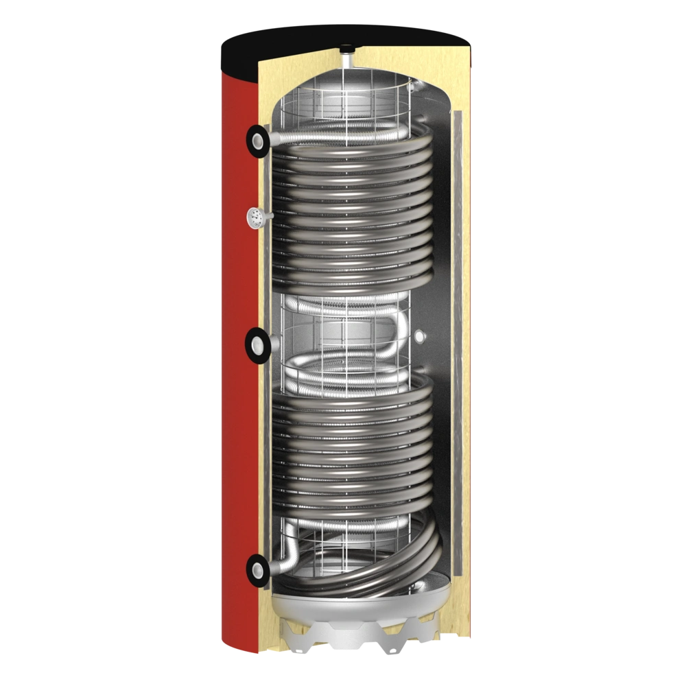 En principe, le ballon peut être relié à un système solaire et à un poêle à bois. L'eau sanitaire serait ensuite chauffée à l'aide de l'échangeur thermique à tubes ondulés en acier inoxydable.