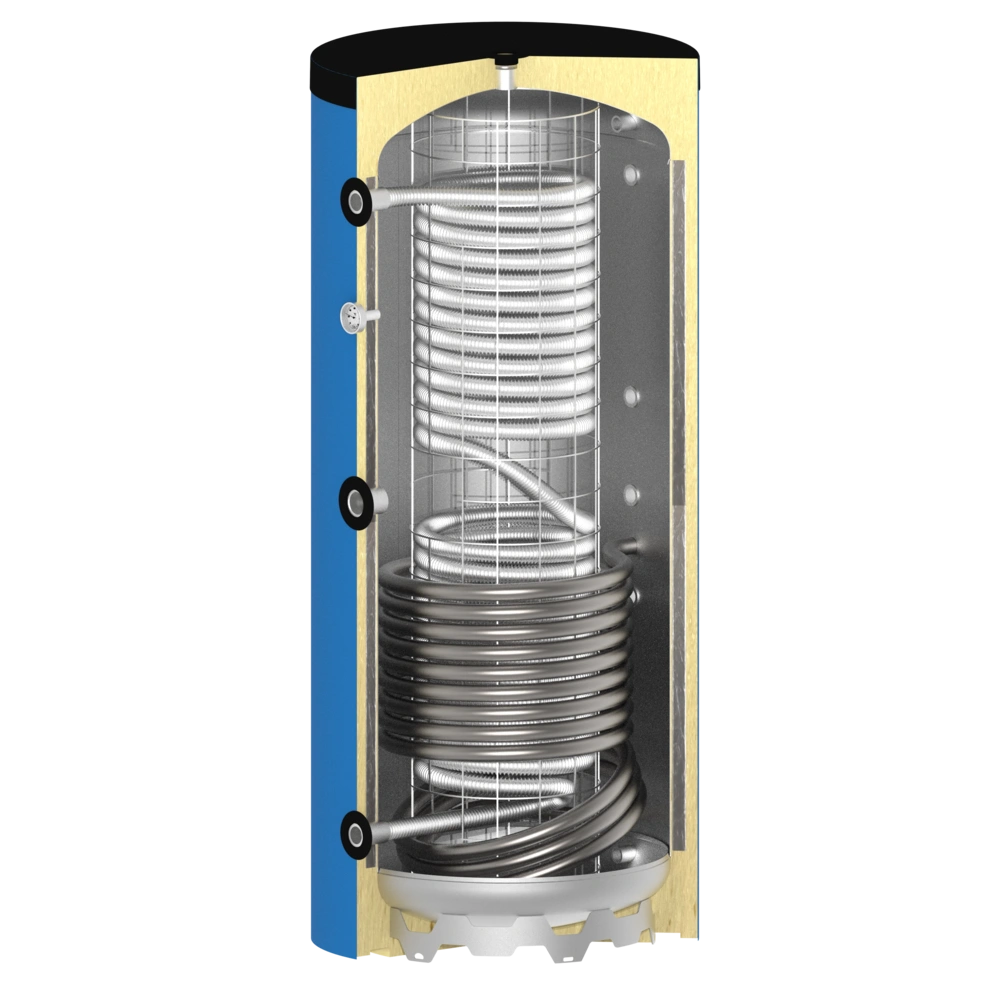 Beim Speicher Accumulatore acqua fresca 200 litri con 1 scambiatore di calore a tubo liscio gibt es nur den Zusatzwärmetauscher unten, in der Standartausführung.