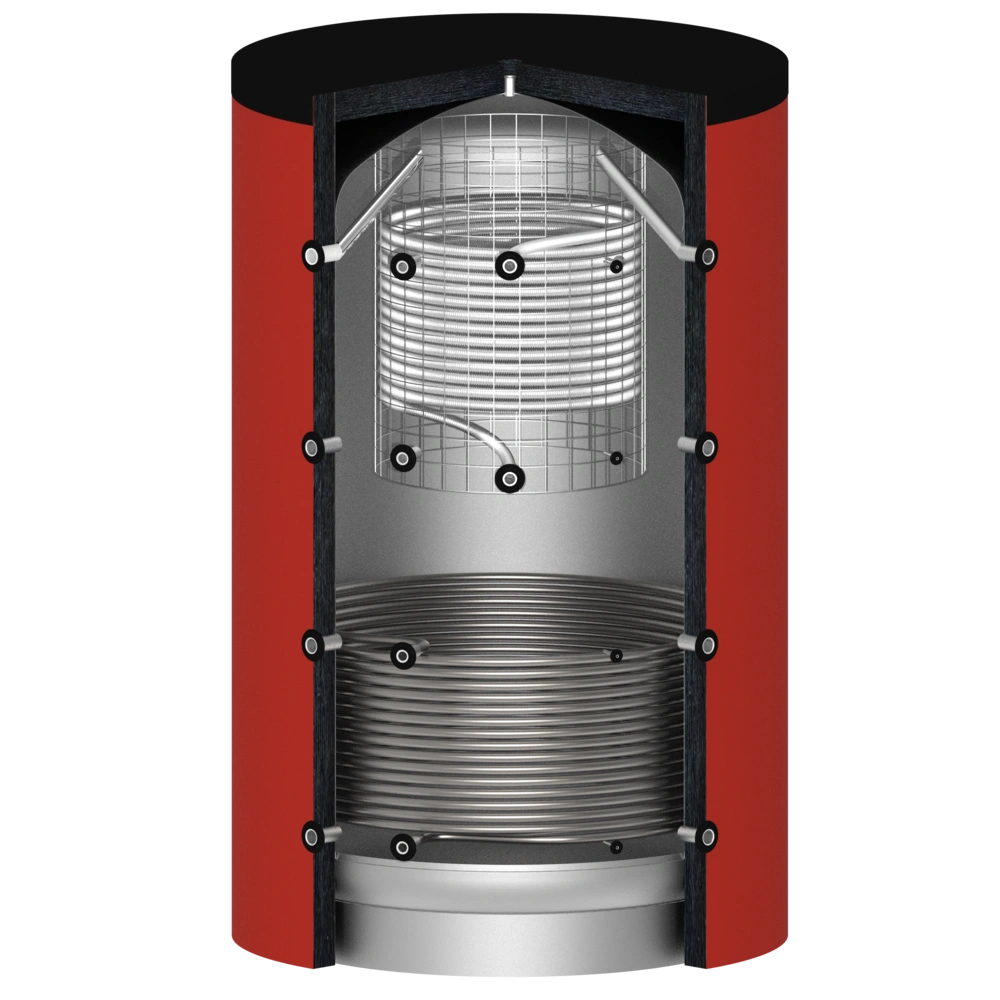 Termoaccumulo per AC tecnica con produzione istantanea di ACS per garantire i più alti standard di igiene dell’acqua potabile ed efficienza energetica. Questo termoaccumulo si differenzia in modo sostanziale dai tradizionali serbatoi di ACS di grande volume. Un tubo corrugato in acciaio inox integrato separa l'acqua potabile da quella di riscaldamento e, al contempo, funge da potente scambiatore di calore. In questo modo, si combinano i vantaggi di un serbatoio di accumulo con quelli di uno scaldacqua istantaneo: l’acqua di riscaldamento funge da vero e proprio accumulatore di calore, mentre l’acqua potabile attraversa il tubo corrugato solo nel momento in cui viene prelevata. Il risultato è un riscaldamento dell'acqua sanitaria sicuro anti- legionella, senza la necessità di programmi di protezione specifici nel regolatore. In questo modo, l'utenza dispone sempre di acqua calda sanitaria, igienicamente perfetta e alla temperatura desiderata.