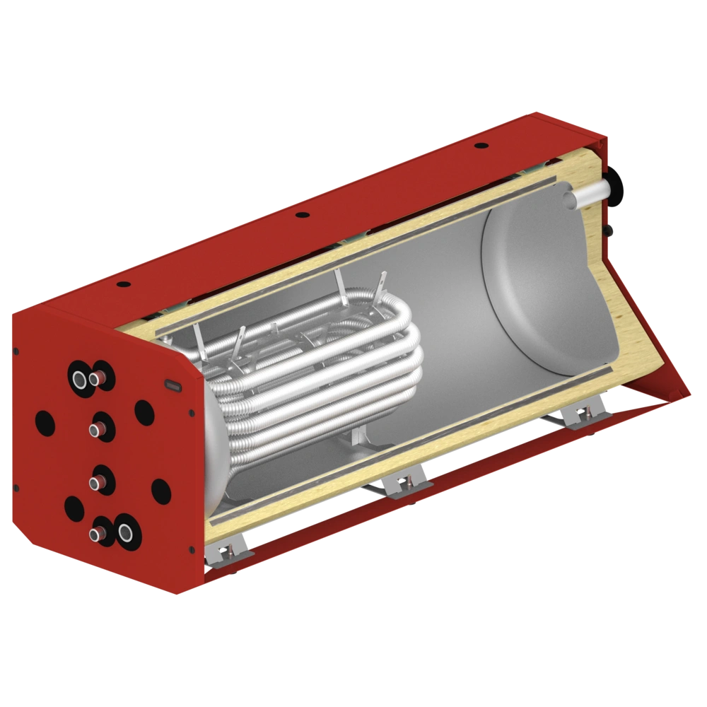 Ce ballon est un stockage d'eau douce. L'eau potable circule à travers un échangeur de chaleur en acier inoxydable et est ainsi chauffée.