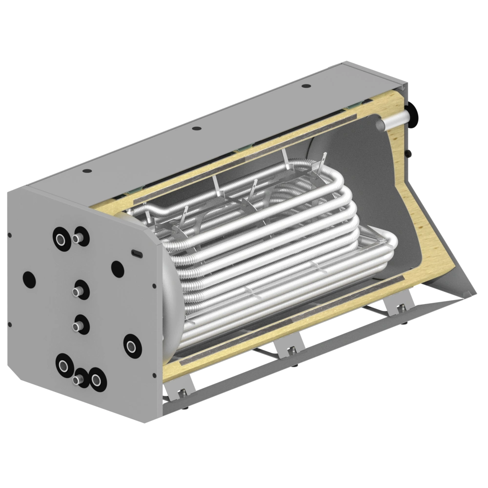 Il design di questi accumulatori si differenzia fondamentalmente dai tradizionali accumulatori di grande volume per ACS. Un tubo integrato in acciaio inox corrugato separa l'acqua potabile da quella di riscaldamento e funge anche da potente scambiatore di calore. L'acqua potabile passa attraverso il tubo in acciaio inox corrugato nell'acqua del bollitore riscaldato solo quando è necessario. Ciò consente di ottenere un consumo energetico molto basso e di garantire ai clienti un'acqua potabile a prova di legionella. Non è necessario un programma di protezione dalla legionella nel regolatore. L'utenza ha sempre a disposizione acqua fresca, igienicamente perfetta e alla temperatura desiderata.