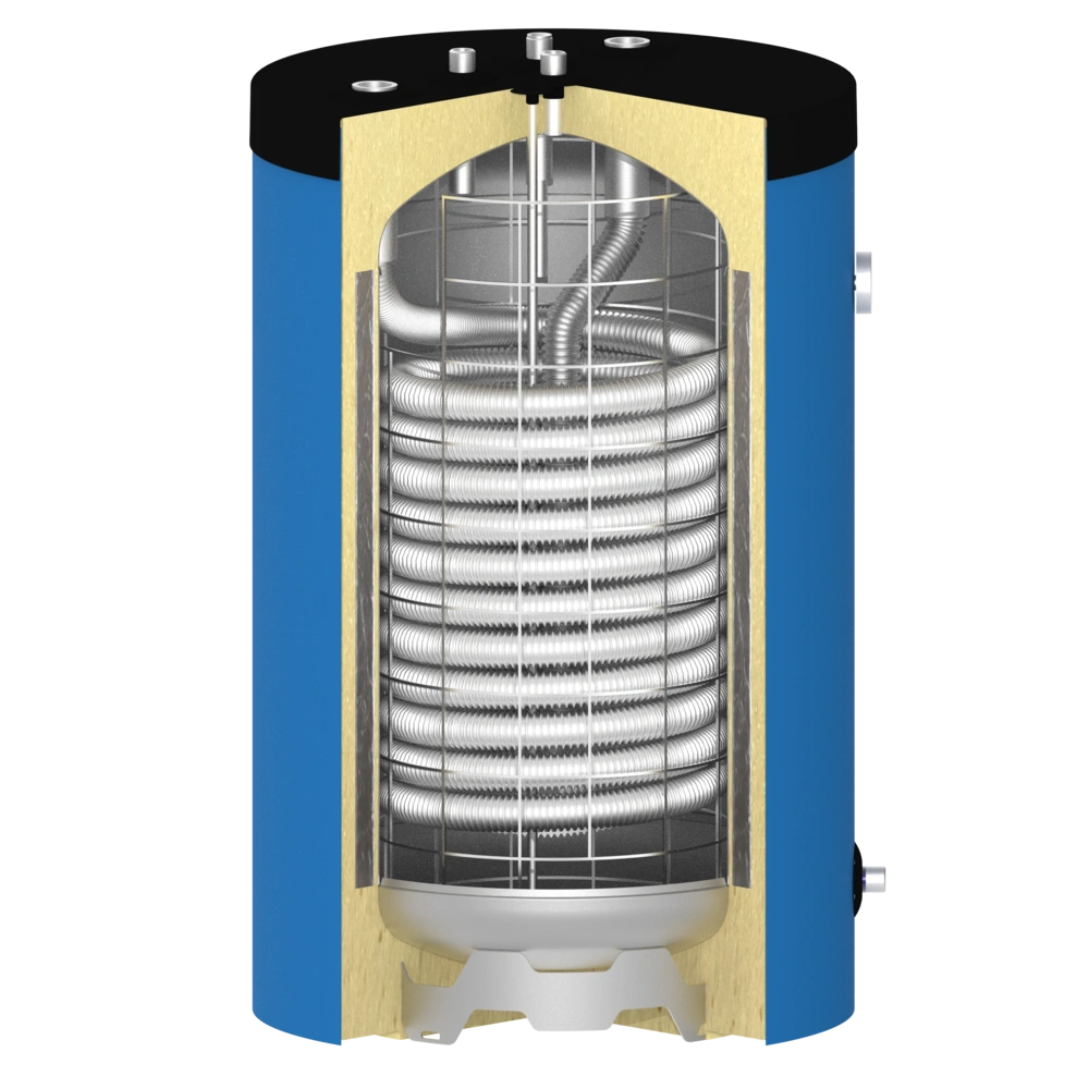 The built-in corrugated stainless steel pipe separates the drinking water from the heating water and also serves as a high-performance heat exchanger. This combines the advantages of a buffer storage tank with those of an instantaneous water heater.