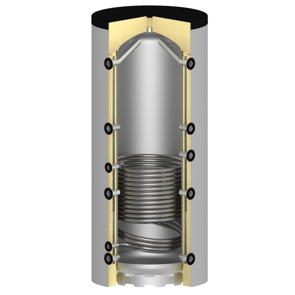 Het spiraal van een buffervat is niet geschikt voor zuurstofrijk tapwater, maar voor een gesloten circuit naar een warmteopwekker.