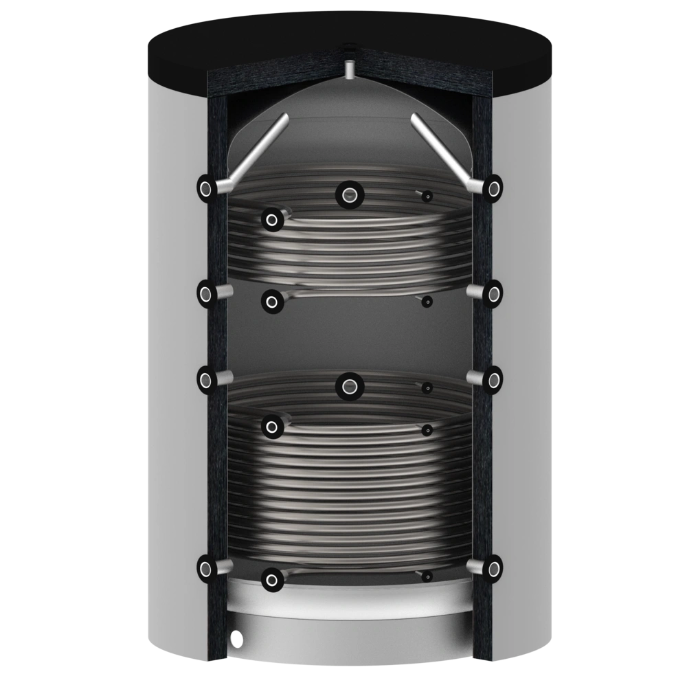 Accumulo inerziale di qualità superiore per le esigenze più elevate di accumulo di calore e di efficienza. Soprattutto quando si utilizzano generatori di calore che raggiungono un'efficienza ottimale solo a pieno carico (ad esempio, molte caldaie a combustibile solido). Durante il funzionamento del generatore di calore, viene generata una quantità di calore superiore all'utenza. Il calore in eccesso riscalda l'acqua dell'accumulo inerziale e viene così immagazzinato. Il bollitore tampone OEG è adatto come accumulatore di caricamento stratificato per impianti solari, pompe di calore, caldaie a biomassa, caldaie a pellet e può essere utilizzato anche nel teleriscaldamento. I due scambiatori di calore a tubo liscio aggiuntivi permettono di integrare altri generatori di calore e di immettere la loro energia nell'accumulo inerziale.