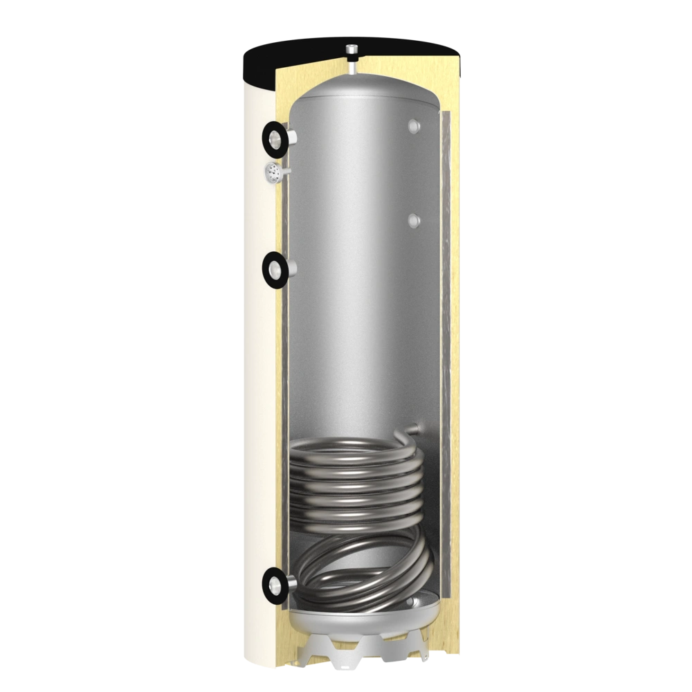 Het spiraal van een buffervat is niet geschikt voor zuurstofrijk tapwater, maar voor een gesloten circuit naar een warmteopwekker.