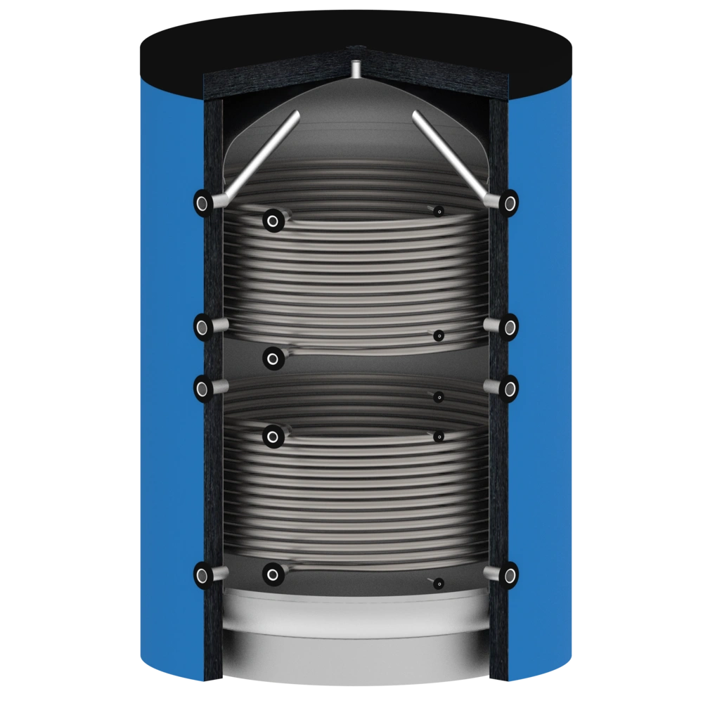Accumulo inerziale di qualità superiore per le esigenze più elevate di accumulo di calore e di efficienza. Soprattutto quando si utilizzano generatori di calore che raggiungono un'efficienza ottimale solo a pieno carico (ad esempio, molte caldaie a combustibile solido). Durante il funzionamento del generatore di calore, viene generata una quantità di calore superiore all'utenza. Il calore in eccesso riscalda l'acqua dell'accumulo inerziale e viene così immagazzinato. Il bollitore tampone OEG è adatto come accumulatore di caricamento stratificato per impianti solari, pompe di calore, caldaie a biomassa, caldaie a pellet e può essere utilizzato anche nel teleriscaldamento. I due scambiatori di calore a tubo liscio aggiuntivi permettono di integrare altri generatori di calore e di immettere la loro energia nell'accumulo inerziale.