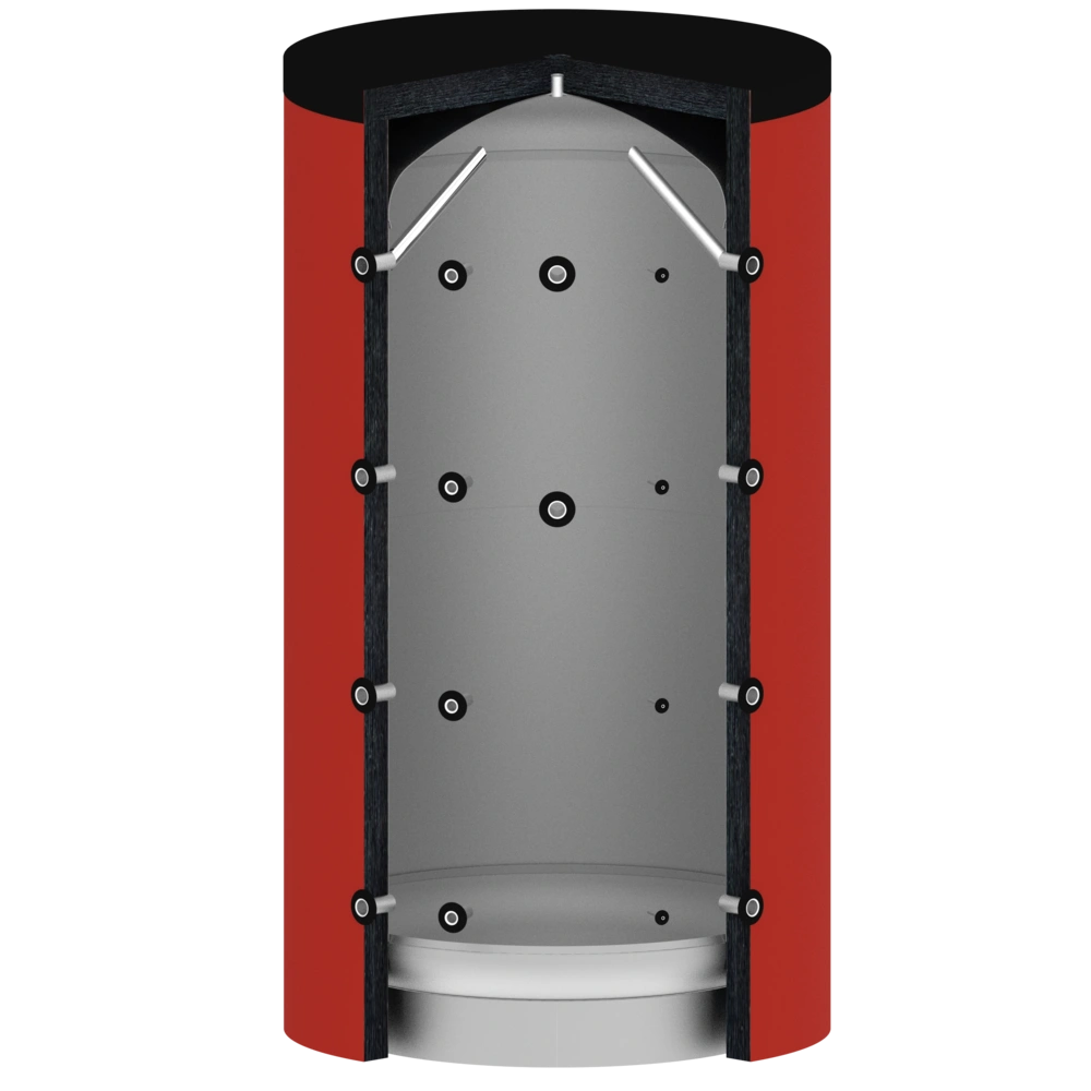 Accumulo inerziale di qualità superiore per le massime esigenze di accumulo di calore e di efficienza. Grazie al guscio di coibentazione altamente efficiente, la dispersione termica è notevolmente ridotta rispetto ai serbatoi standard. Il compito dell'accumulo inerziale è quello di compensare la differenza tra il calore generato e quello consumato. In questo modo, i generatori di calore possono funzionare in modo più indipendente dall'utenza.
