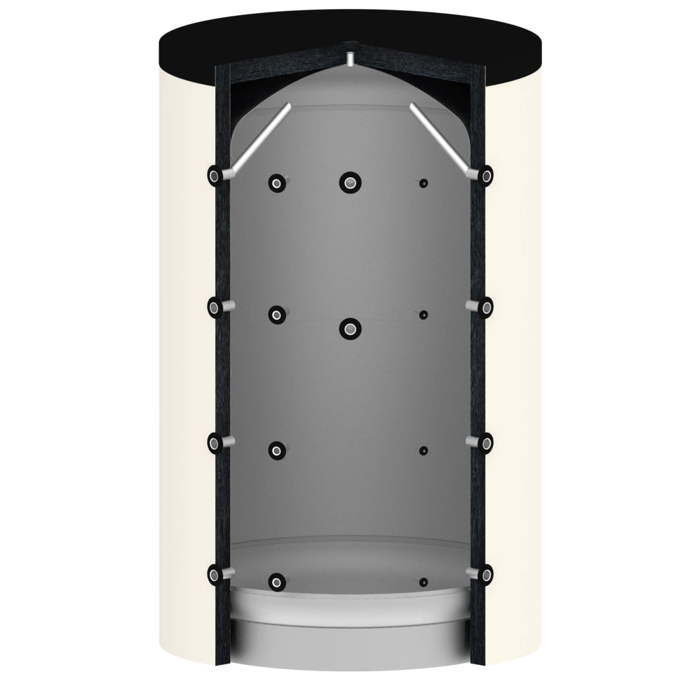 Accumulo inerziale di qualità superiore per le massime esigenze di accumulo di calore e di efficienza. Grazie al guscio di coibentazione altamente efficiente, la dispersione termica è notevolmente ridotta rispetto ai serbatoi standard. Il compito dell'accumulo inerziale è quello di compensare la differenza tra il calore generato e quello consumato. In questo modo, i generatori di calore possono funzionare in modo più indipendente dall'utenza.
