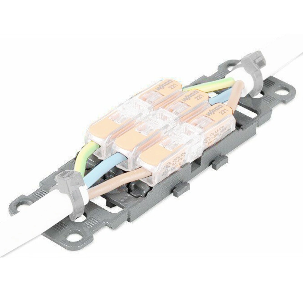 Piastra adattatore per il fissaggio di connettori a passaggio della serie 221 su guide DIN e profili portanti. I connettori a passaggio vengono fissati tramite un semplice scatto sulla piastra adattatore. Il piede a scatto della piastra adattatore viene fissata a clic sul supporto a profilo per la cassetta di distribuzione.