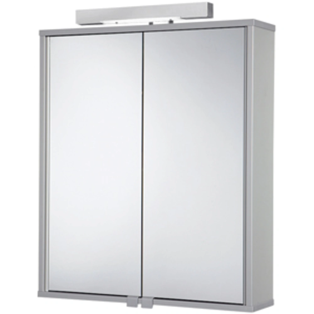 Archivio a specchio in alluminio con doppie ante a specchio e due inserti in vetro regolabili in altezza per tutti gli utensili da bagno più importanti. L'armadietto a specchio è dotato di una presa di corrente con interruttore e di una luce LED annessa.