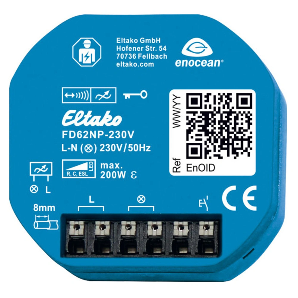 Attuatore dimmerabile universale senza connessione N con tecnologia EnOcean e MOSFET di potenza per pulsanti universali wireless, pulsanti direzionali, pulsanti di controllo centrale e sensori di movimento. La commutazione zero-crossing con soft on e soft off serve a proteggere le lampade. È possibile attivare la radio bidirezionale e l'attuatore radio è dotato di protezione elettronica automatica contro il sovraccarico e lo spegnimento per sovratemperatura. Il livello di luminosità impostato viene salvato quando la luce viene spenta. La perdita in standby è di soli 0,6 watt e la luce si spegne in caso di interruzione di corrente. Oltre all'ingresso del radiocomando tramite antenna interna, questo attuatore radio può essere controllato localmente con un pulsante di comando a 230V montato davanti ad esso.