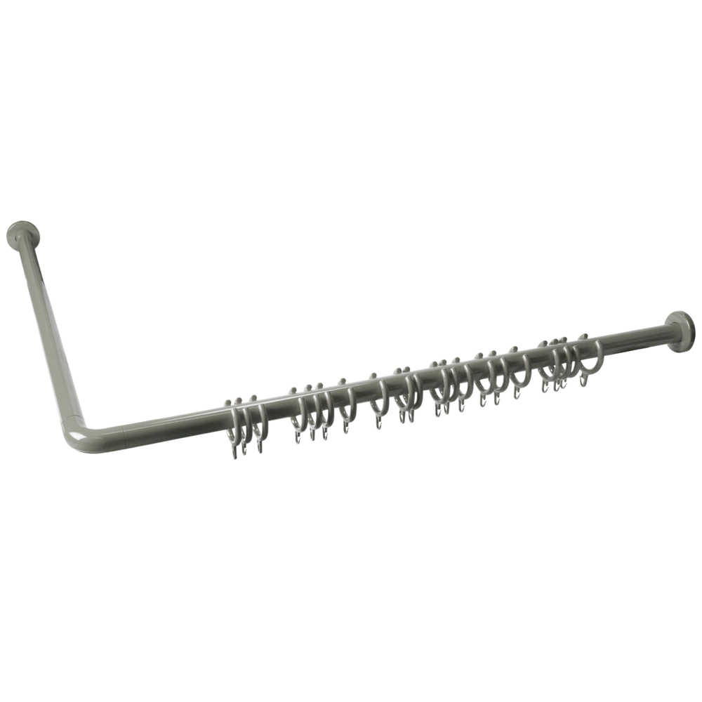 Die Duschvorhangstange ist zweischenklig, sie ist 1000 x 1000 mm lang. Die technische Dokumentation wird hinterlegt.
