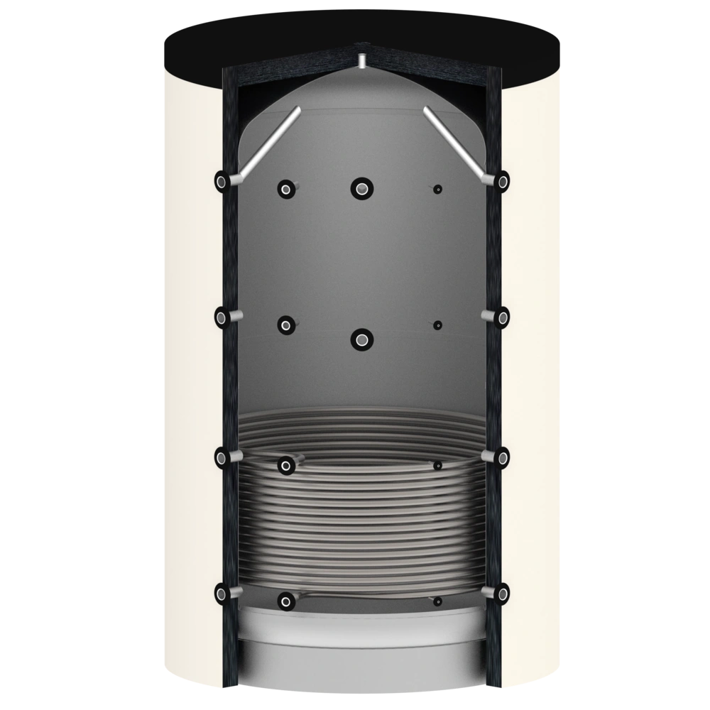Accumulo inerziale di qualità superiore per le esigenze più elevate di accumulo di calore e di efficienza. Soprattutto quando si utilizzano generatori di calore che raggiungono un'efficienza ottimale solo a pieno carico (ad esempio, molte caldaie a combustibile solido). Durante il funzionamento del generatore di calore, viene generata una quantità di calore superiore all'utenza. Il calore in eccesso riscalda l'acqua dell'accumulo inerziale e viene così immagazzinato. Il bollitore tampone OEG è adatto come accumulatore di caricamento stratificato per impianti solari, pompe di calore, caldaie a biomassa, caldaie a pellet e può essere utilizzato anche nel teleriscaldamento. Lo scambiatore di calore a tubo liscio aggiuntivo consente di integrare un generatore di calore supplementare e di immettere la sua energia nell'accumulo inerziale.