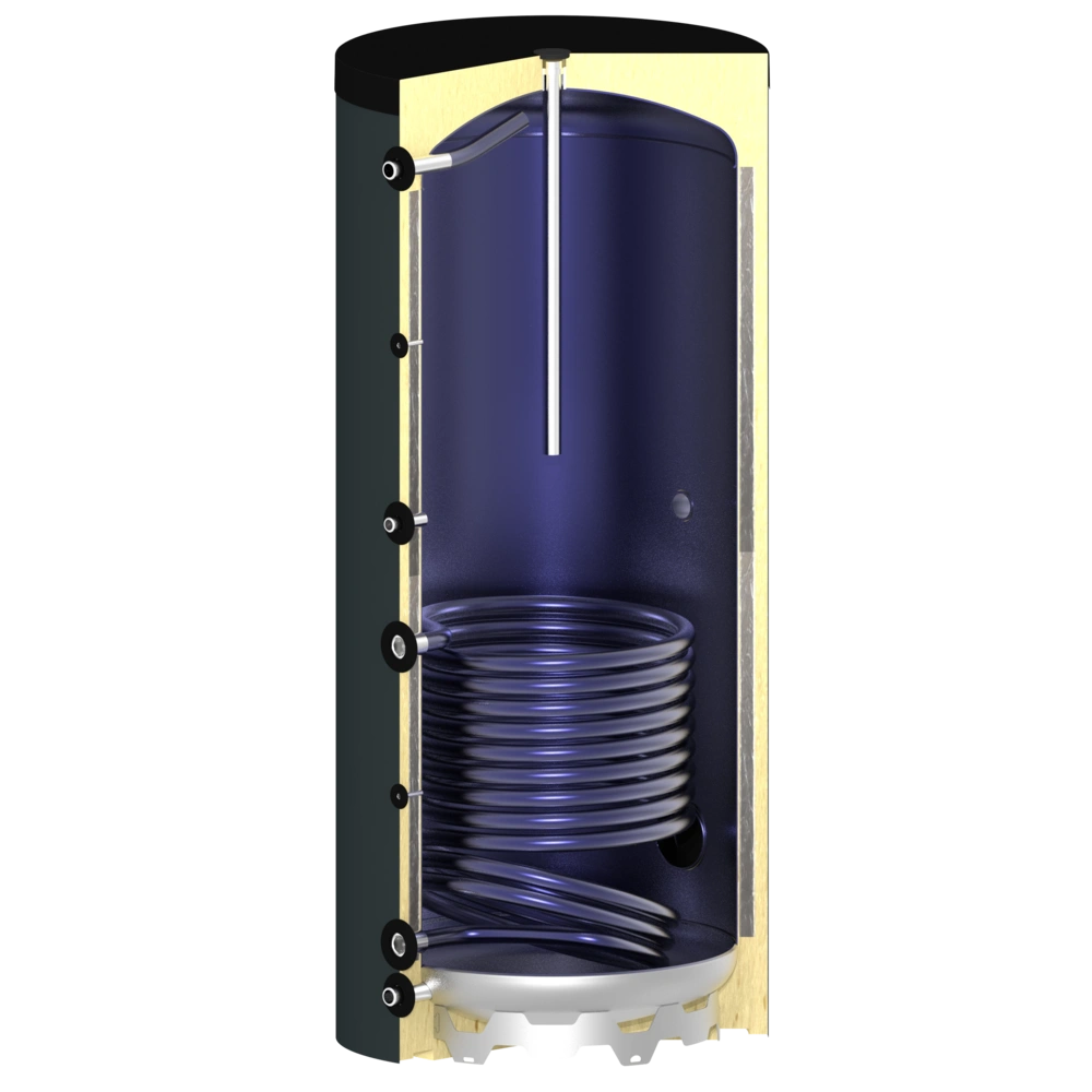 La superficie interna del bollitore ha una finitura smaltata di alta qualità. La superficie dello scambiatore di calore di dimensioni generose, che si estende fino al pavimento, garantisce un ottimo scambio di calore. Una flangia d'ispezione laterale consente una facile manutenzione e pulizia del bollitore e, se necessario, può essere equipaggiato con un manicotto per la resistenza. L'impareggiabile isolamento sottovuoto OEG dei cilindri ha perdite di calore significativamente inferiori rispetto al guscio di coibentazione dei cilindri standard presenti sul mercato.