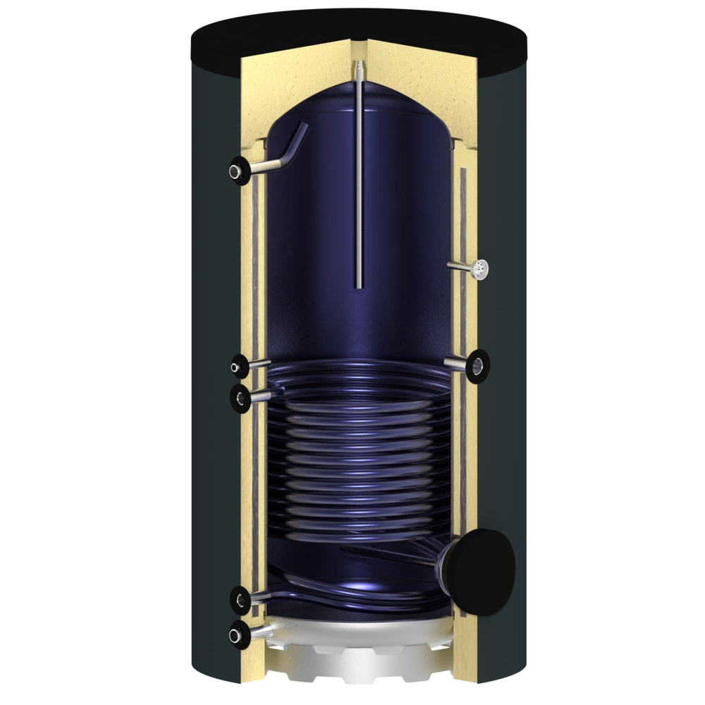 La superficie interna del bollitore ha una finitura smaltata di alta qualità. La superficie dello scambiatore di calore di dimensioni generose, che si estende fino al pavimento, garantisce un ottimo scambio di calore. Una flangia d'ispezione laterale consente una facile manutenzione e pulizia del bollitore e, se necessario, può essere equipaggiato con un manicotto per la resistenza. L'impareggiabile isolamento sottovuoto OEG dei cilindri ha perdite di calore significativamente inferiori rispetto al guscio di coibentazione dei cilindri standard presenti sul mercato.