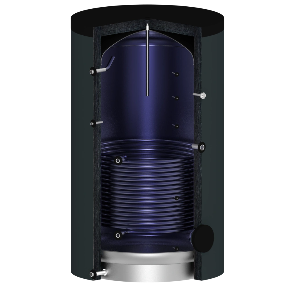 La superficie interna del bollitore ha una finitura smaltata di alta qualità. La superficie dello scambiatore di calore di dimensioni generose, che si estende fino al pavimento, garantisce un ottimo scambio di calore. Una flangia d'ispezione laterale consente una facile manutenzione e pulizia del bollitore e, se necessario, può essere equipaggiato con un manicotto per la resistenza. L'impareggiabile isolamento sottovuoto OEG dei cilindri ha perdite di calore significativamente inferiori rispetto al guscio di coibentazione dei cilindri standard presenti sul mercato.