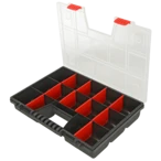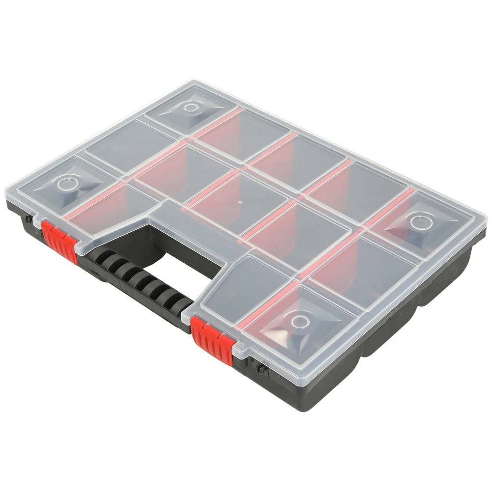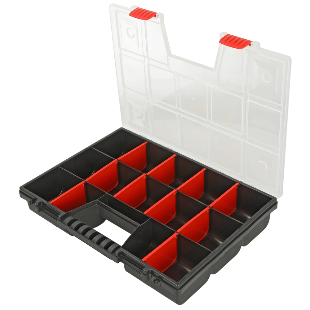 Box d'assortimento in plastica infrangibile con coperchio trasparente e compartimenti regolabili. Il contenuto è visibile anche quando il coperchio è chiuso e sicuro contro il disordine durante il trasporto...