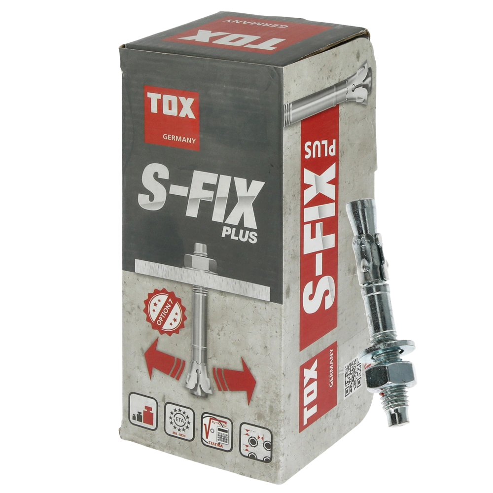 Il TOX bullone S-FIX PLUS è un set di fissaggio galvanizzato con filo lungo, rondella e dado esagonale. I bulloni sono adatti per fissare scaffali in piedi, ringhiere, vaschette per cavi e molto altro. Possono essere utilizzati in calcestruzzo non fessurato. I bulloni offrono una presa sicura e un breve tempo d'installazione, sono approvati dalle autorità edilizie e testati per la classe di resistenza al fuoco. Il collo smussato protegge il filo quando si martella. Il diametro del foro deve essere di 10 mm.