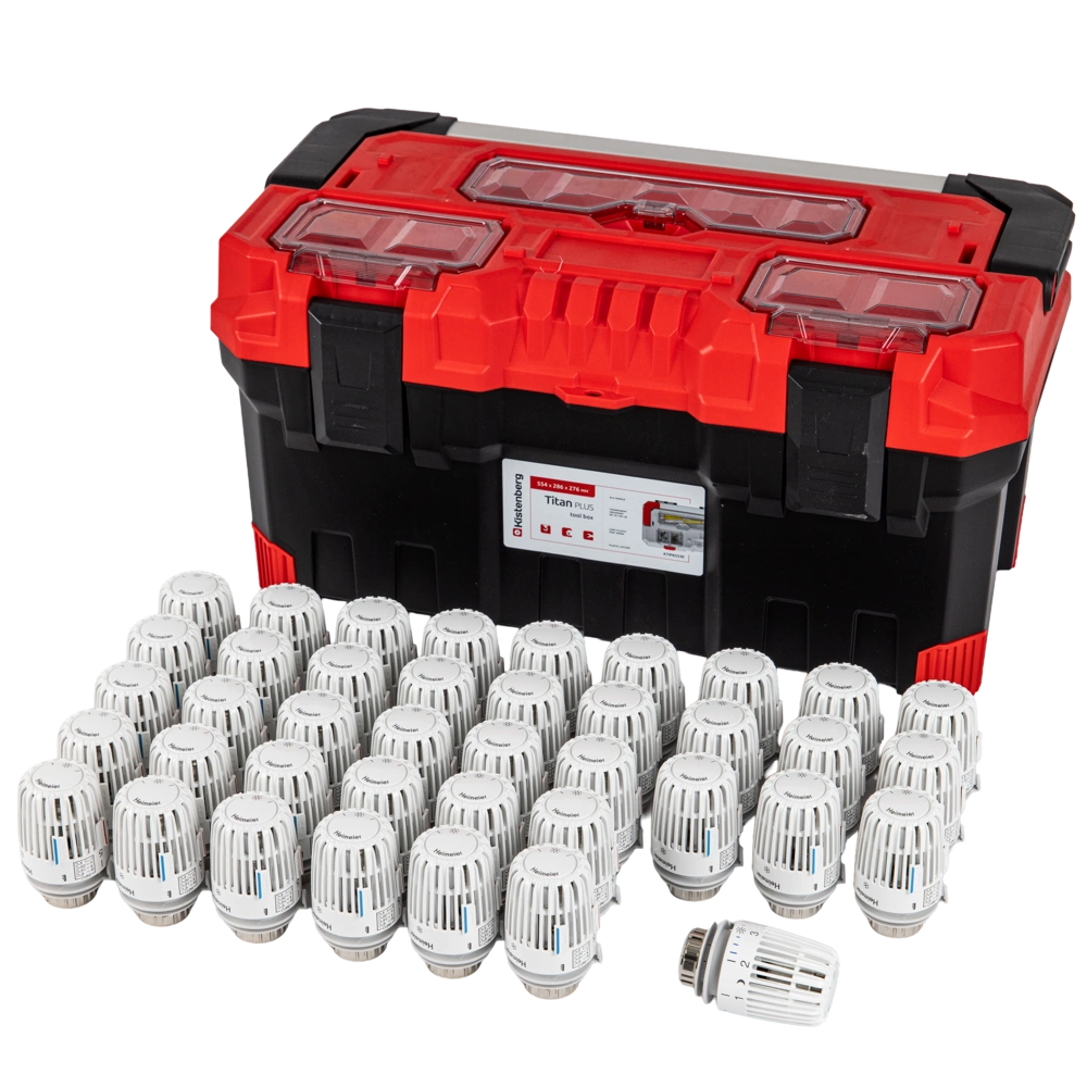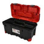 Tutte le informazioni sul prodotto FornituraLa robusta cassetta degli attrezzi è dotata di robuste chiusure e manico in alluminio. Una custodia per il trasporto e tre scomparti trasparenti per le parti piccole garantiscono una distribuzione sensata. La scatola è resistente agli oli e ai prodotti chimici.