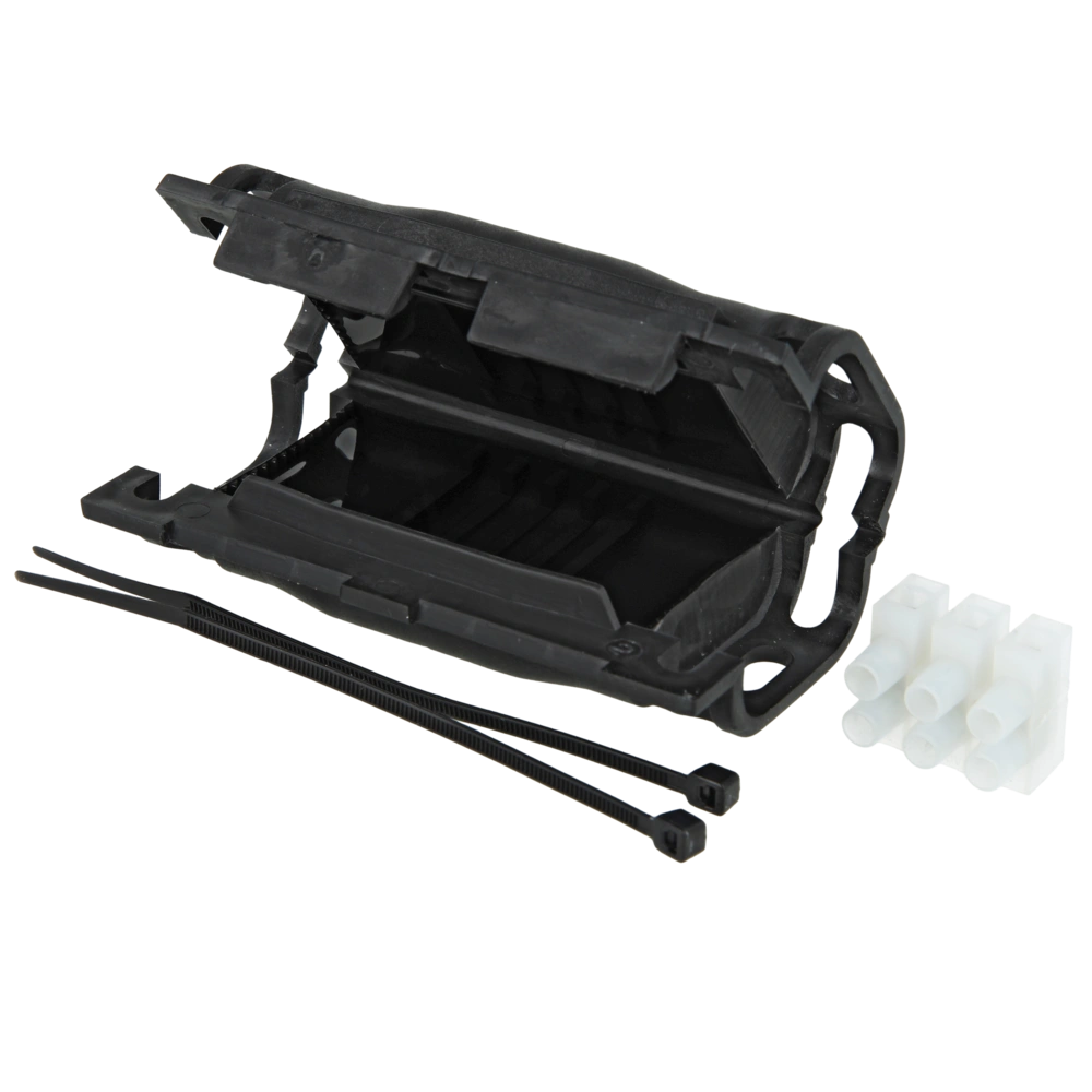 Manicotto di giunzione pre-riempito in gel per l'isolamento e la sigillatura di connessioni di cavi comuni di piccola sezione in plastica con 3 o 5 conduttori, con blocco di derivazione per tutte le sezioni trasversali disponibili. L'alloggiamento della scatola di derivazione autoestinguente e resistente ai raggi UV è realizzato in solida plastica di alta qualità resistente agli urti. Il manicotto di giunzione con gel è adatto per uso interno ed esterno. Si può posare anche sottoterra o in acqua. L’installazione è rapida e semplice.