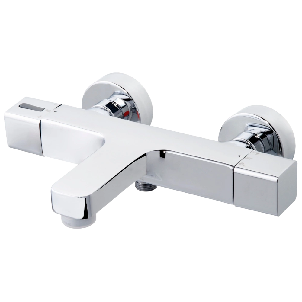Miscelatore termostatico per vasca da bagno, montaggio a parete, con deviatore vasca/doccia integrato, protezione antiscottatura a 38°C e valvoline antiritorno incorporate.