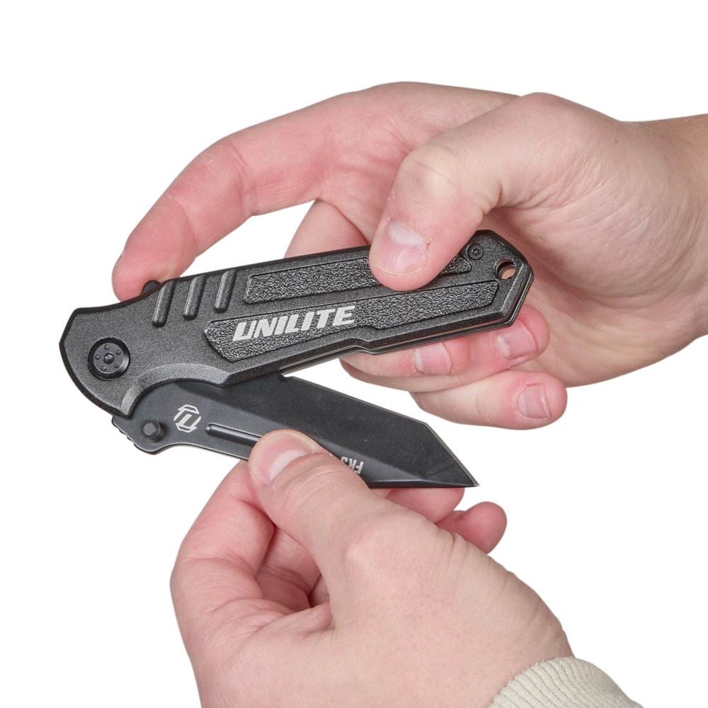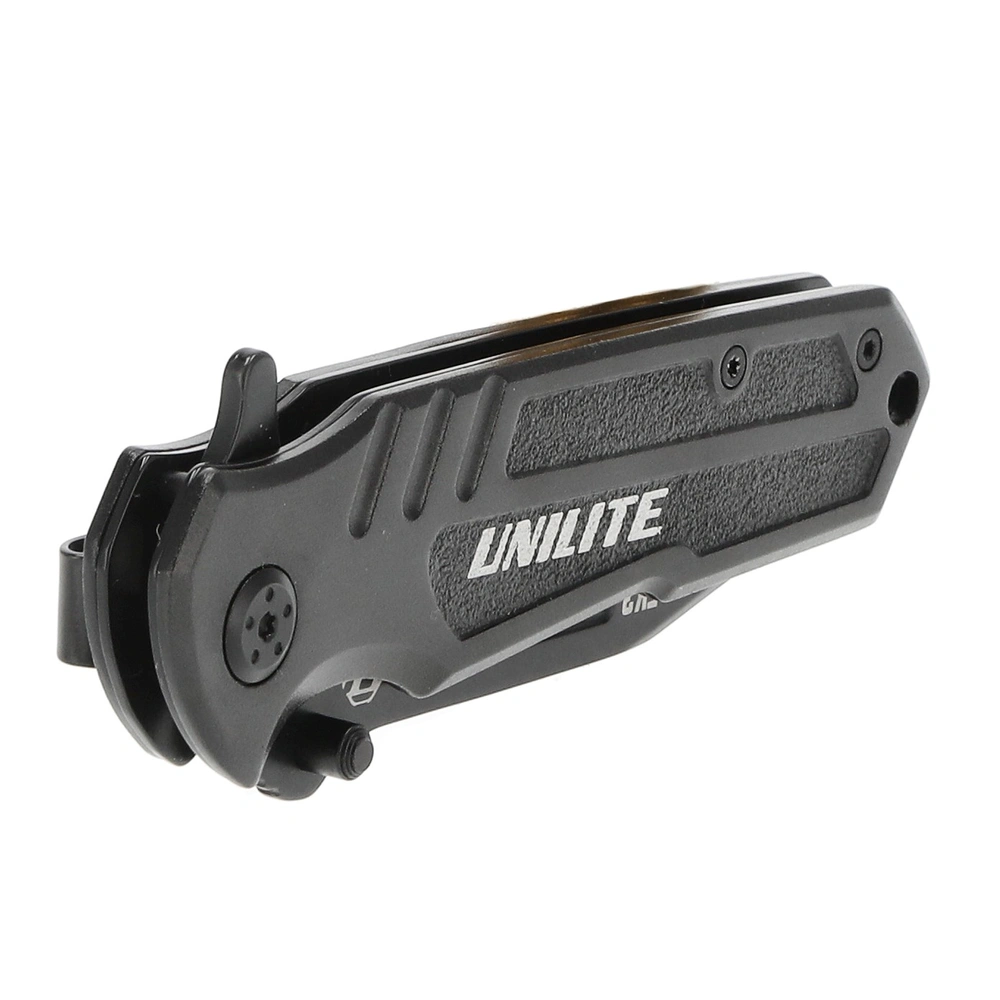 L'impugnatura ergonomica in alluminio con protezione integrata per le dita e il perno per il pollice sul retro della lama assicurano che il coltello pieghevole sia comodo e sicuro nella mano. Il coltello è dotato di una pratica clip da tasca per un comodo trasporto.