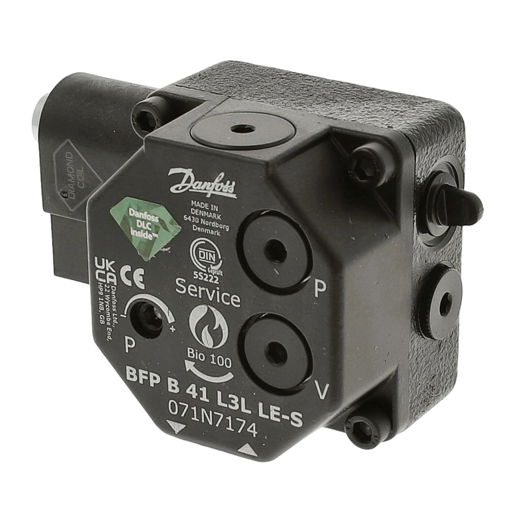 La pompa gasolio Danfoss Diamond BFP 41 L3 è compatta e a rotazione sinistra nella custodia standard con una valvola magnetica NC al lato, un regolatore a membrana, un filtro cartuccia e un'impostazione di pressione superiore...