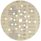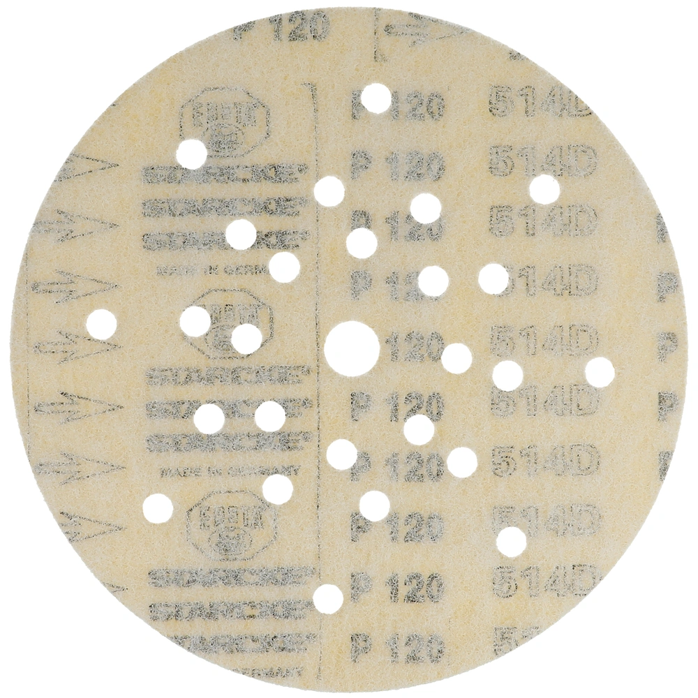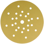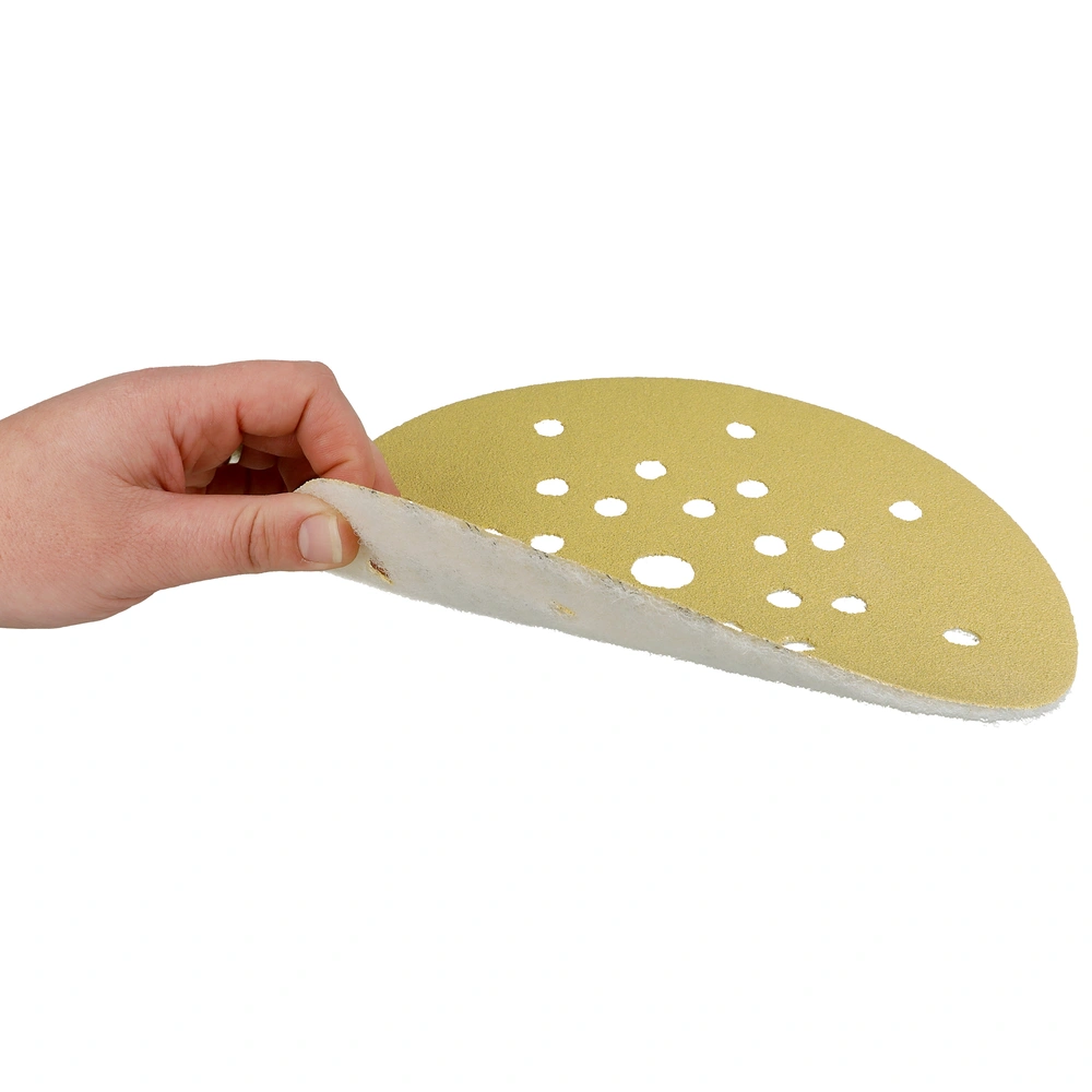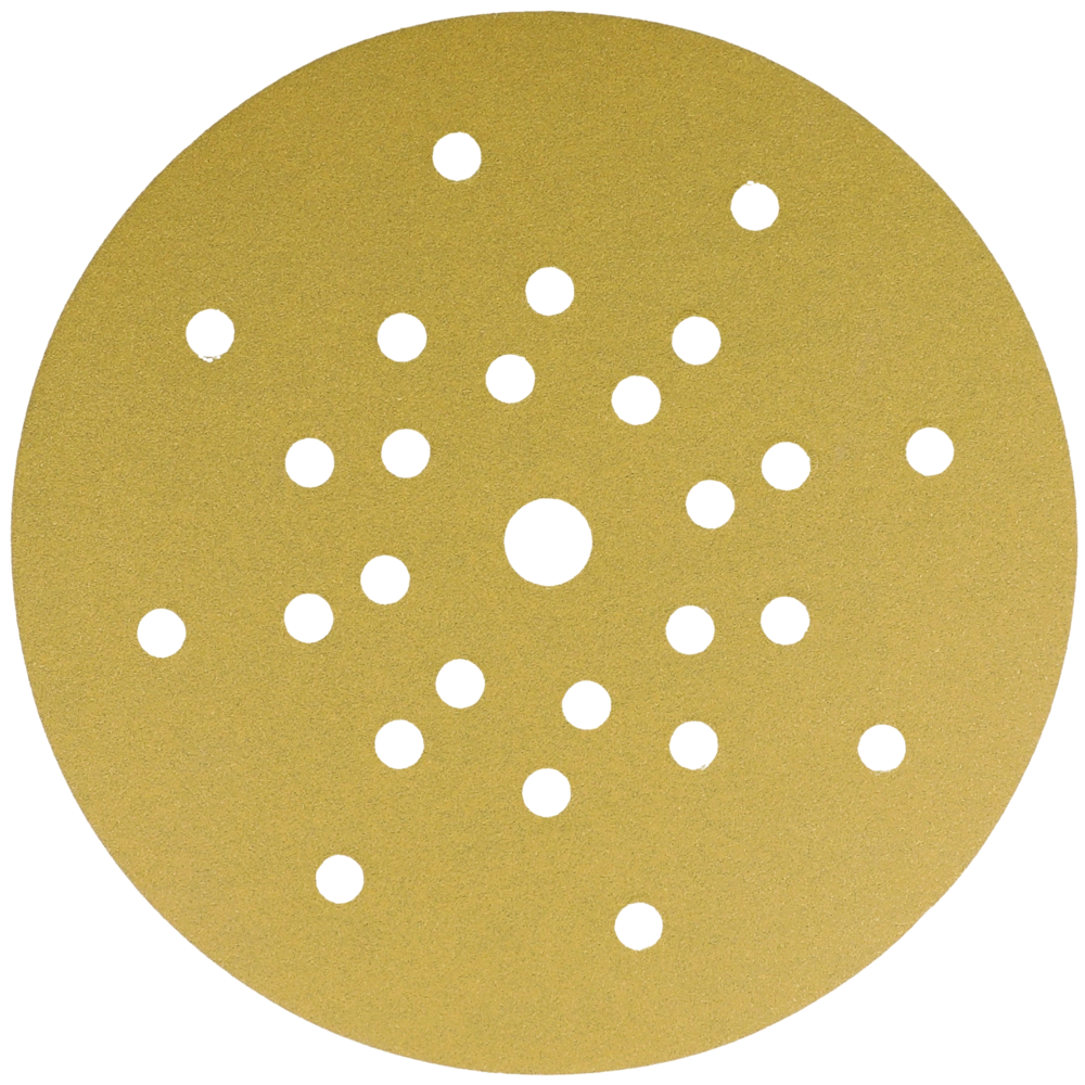 Abrasivo per l'abrasione ad asciutto e l'uso su smergliatrici a collo lungo nel montaggio asciutto e su smergliatrici di pavimento. Grano in corindone ad alta qualità per la lavorazione di superfici, verniciature, lacca e spatole. Più gran effetto con l'uso tenero. Con fori e tessuto speciale adatti per l'aspirazione di polvere. Il meno di emissioni di polvere grazie a 8 fori su un raggio di 70 mm, 10 fori su un raggio di 105 mm e 8 fori su un raggio di 165 mm.