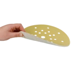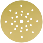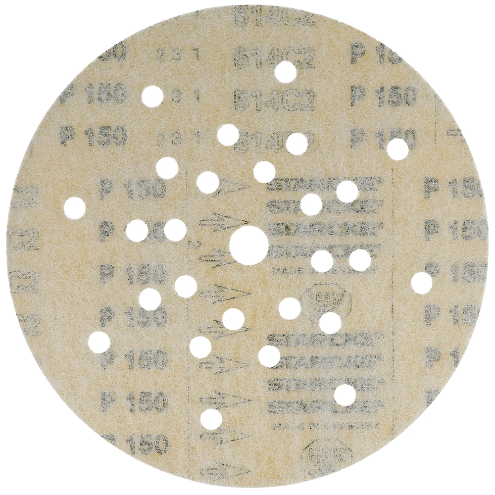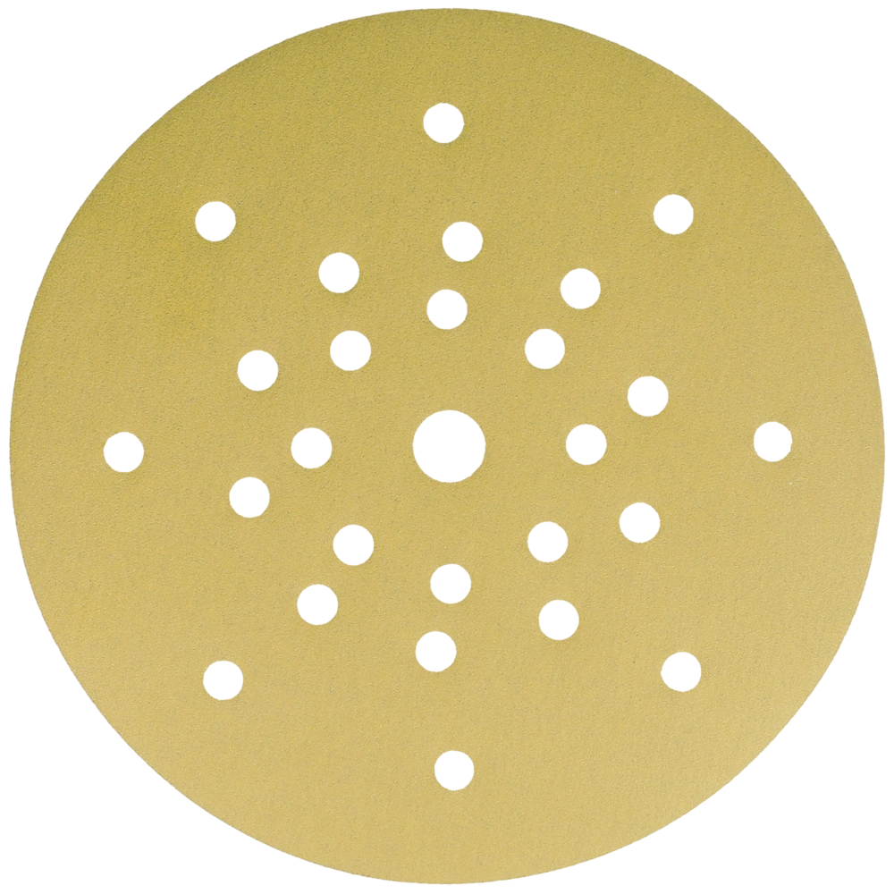 Abrasivo per l'abrasione ad asciutto e l'uso su smergliatrici a collo lungo nel montaggio asciutto e su smergliatrici di pavimento. Grano in corindone ad alta qualità per la lavorazione di superfici, verniciature, lacca e spatole. Più gran effetto con l'uso tenero. Con fori e tessuto speciale adatti per l'aspirazione di polvere. Il meno di emissioni di polvere grazie a 8 fori su un raggio di 70 mm, 10 fori su un raggio di 105 mm e 8 fori su un raggio di 165 mm.
