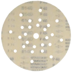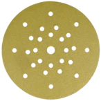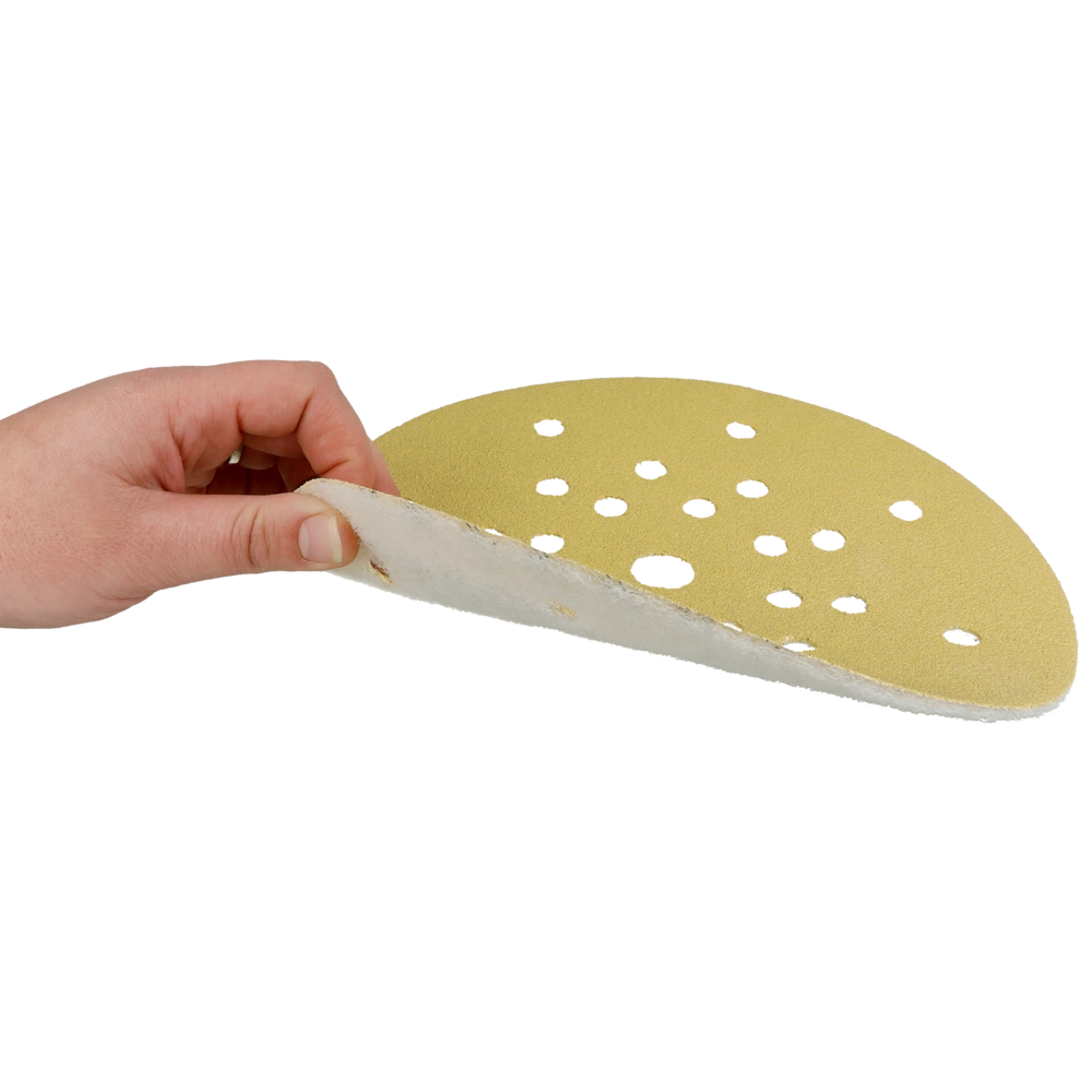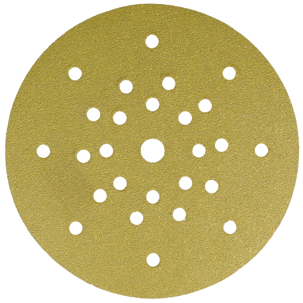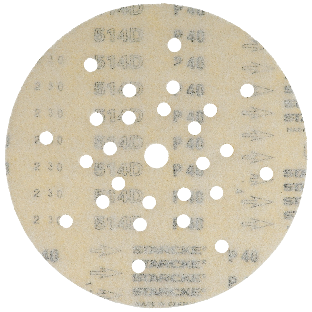 Abrasivo per abrasione ad asciutto per l'uso su smergliatrici a collo lungo nel montaggio ad asciutto e su smergliatrici per pavimenti. Grano in corindone ad alta qualità per la lavorazione di superfici, verniciature, lacca e spatole. Più alto effetto a comando lievo. Con perforazione e tessuto seciale per l'aspirazione di polvere. Minimali emissioni di polvere grazie a 8 fori con un raggio di 70 mm, 10 fori con un raggio di 105 mm e 8 fori con un raggio di 165 mm.