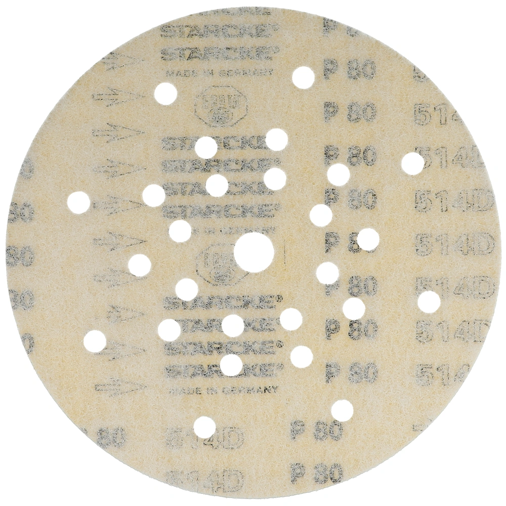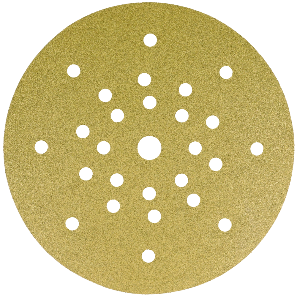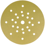 Abrasivo per l'abrasione ad asciutto e l'uso su smergliatrici a collo lungo nel montaggio asciutto e su smergliatrici di pavimento. Grano in corindone ad alta qualità per la lavorazione di superfici, verniciature, lacca e spatole. Più gran effetto con l'uso tenero. Con fori e tessuto speciale adatti per l'aspirazione di polvere. Il meno di emissioni di polvere grazie a 8 fori su un raggio di 70 mm, 10 fori su un raggio di 105 mm e 8 fori su un raggio di 165 mm.