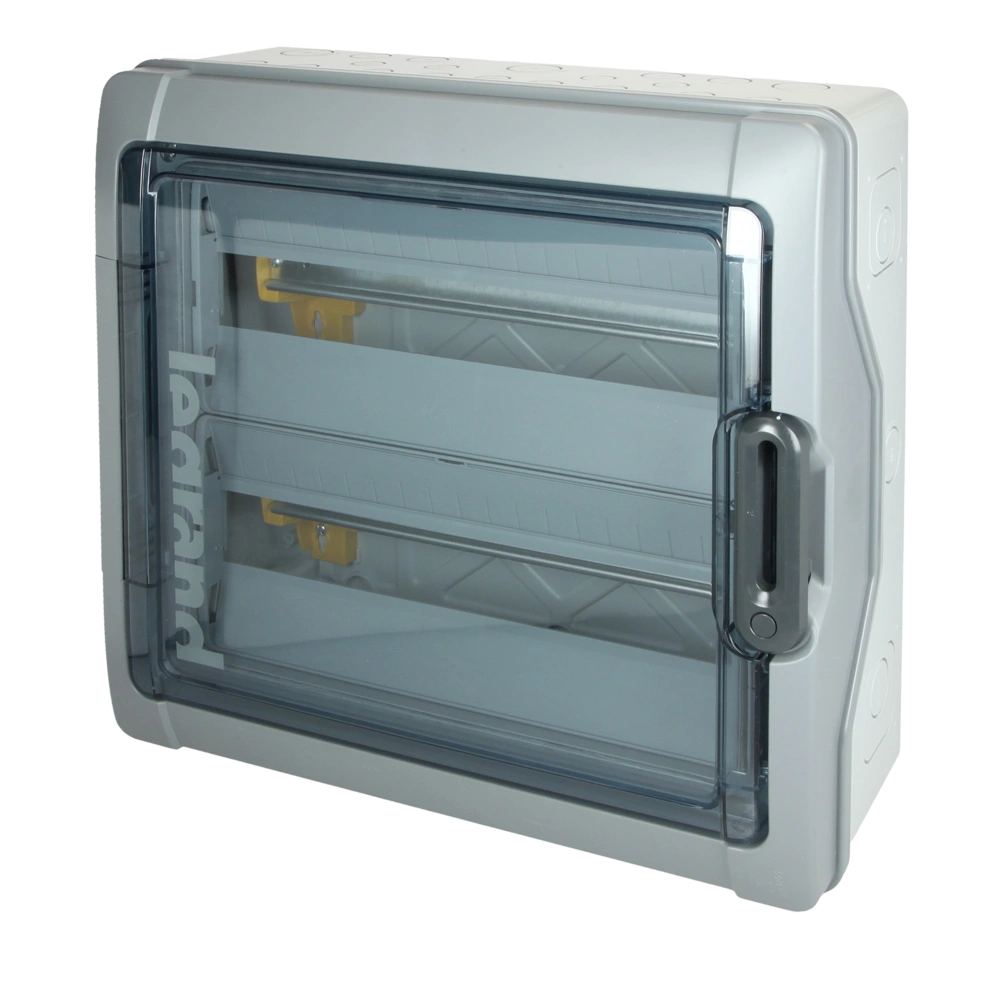 Distributore per ambienti umidi da installare in garage, carport e stalle. Protegge i componenti elettrici da acqua e polvere. Il robusto alloggiamento è in grado di resistere anche alle condizioni più difficili. La porta trasparente può essere incernierata su entrambi i lati e dotata di serratura. Le file di distributori regolabili in altezza possono ospitare dispositivi con una profondità di installazione di 48,5 mm e fino a 63 A. La guida di supporto offre spazio sufficiente per un passaggio cavi appena visibile. È inoltre preinstallata una guida con terminali N e terminali PE. I passacavi pre-stampati assicurano una facile installazione dei cavi nel quadro di distribuzione.