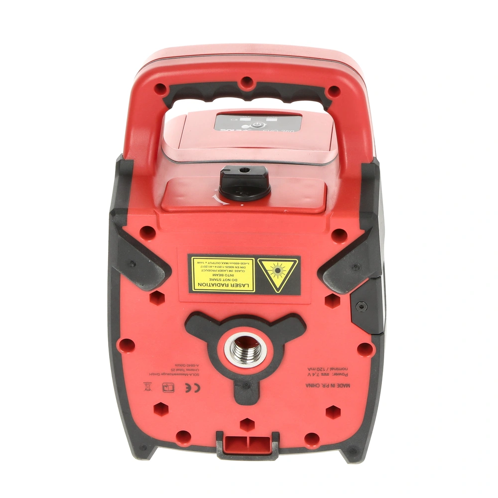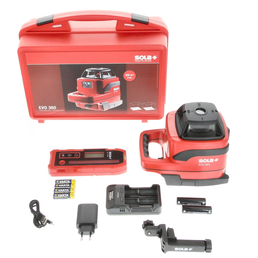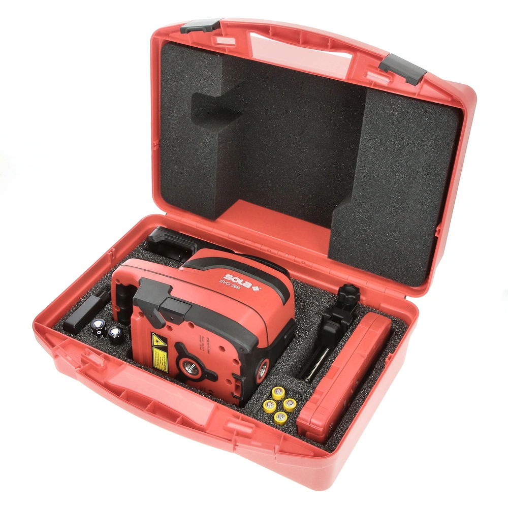 Livella laser rotante autolivellante per scansione in direzione orizzontale e verticale, adatta all'uso in ambienti interni ed esterni. La livella EVO 360 consente un uso intuitivo e facile con un solo pulsante. Questo strumento di elevata precisione consente il livellamento di pareti, di profili per controsoffitti e pareti divisorie in cartongesso e determinare allineamenti. Con un campo di azione preciso fino a 300 m grazie al ricevitore laser portatile, la livella laser può essere utilizzata anche per una rapida e precisa misurazione di terreni, strade, facciate e distanze in genere. Con la funzione addizionale di punto a piombo, la livella a laser è in grado di proiettare fasci di luce luminosa a forma di punto perfettamente ortogonali su soffitti o pareti. Se sottoposto a vibrazioni, scosse o urti che possono causare errori di livellamento, il laser rotante si spegne automaticamente. Le celle agli ioni di litio ricaricabili garantiscono le massime prestazioni e autonomia di lavoro fino a 40 ore.