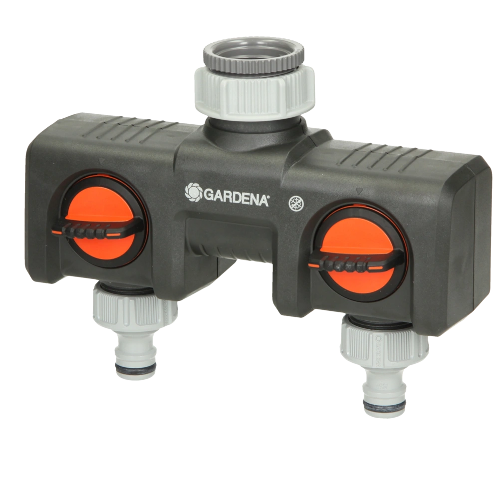Distributore a due vie con due uscite per il collegamento simultaneo di 2 dispositivi di irrigazione, computer o timer. Il distributore può essere collegato a rubinetti con filettatura 3/4"- o 1"-maschio...