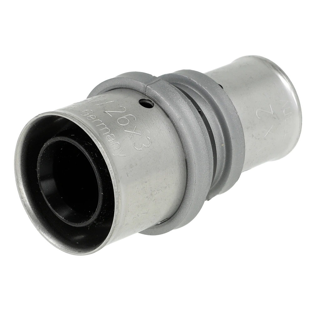 Raccordo a pressare realizzato in materiale plastico ad alte prestazioni, il polifenilsulfone, con eccezionali caratteristiche di resistenza meccanica e alla corrosione. Questo raccordo offre enormi vantaggi, in termini di praticità e velocità, semplicità di montaggio con affidabilità e sicurezza della tenuta nel tempo. Il raccordo in PPSU senza piombo è dotato di due o-ring e tre finestre di controllo per vedere se il tubo multistrato ha raggiunto la corretta posizione di inserimento prima della pressatura. Grazie al multiprofilo, questo raccordo a compressione può essere utilizzato indifferentemente con 2 profili di pressatura, il profilo TH per tutte le grandezze e il profilo U per tubi con sezione da 16 a 32 mm. Il rigido anello fermabussola in plastica garantisce una salda pressatura in qualsiasi posizione di montaggio. Durante il controllo della tenuta il raccordo non pressato perde. Ciò consente individuare ed eliminare perdite durante la prova di tenuta. Grazie al libero flusso attraverso la giunzione, il raccordo a pressare riduce al minimo le perdite di carico e non si sentono rumori di flusso fastidiosi.