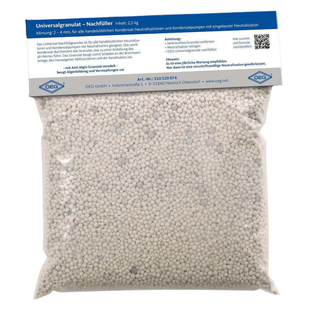 Tutte le informazioni sul prodottoIl granulato per ricarica universale è adatto per neutralizzatori commerciali e pompe di condensa con neutralizzazione. Il condensato acido fluisce il granulato che aumenta il valore pH. Il granulato evita in questo modo danni alle caldaie a condensazione, ai tubi di scarico e alla canalizzazione.