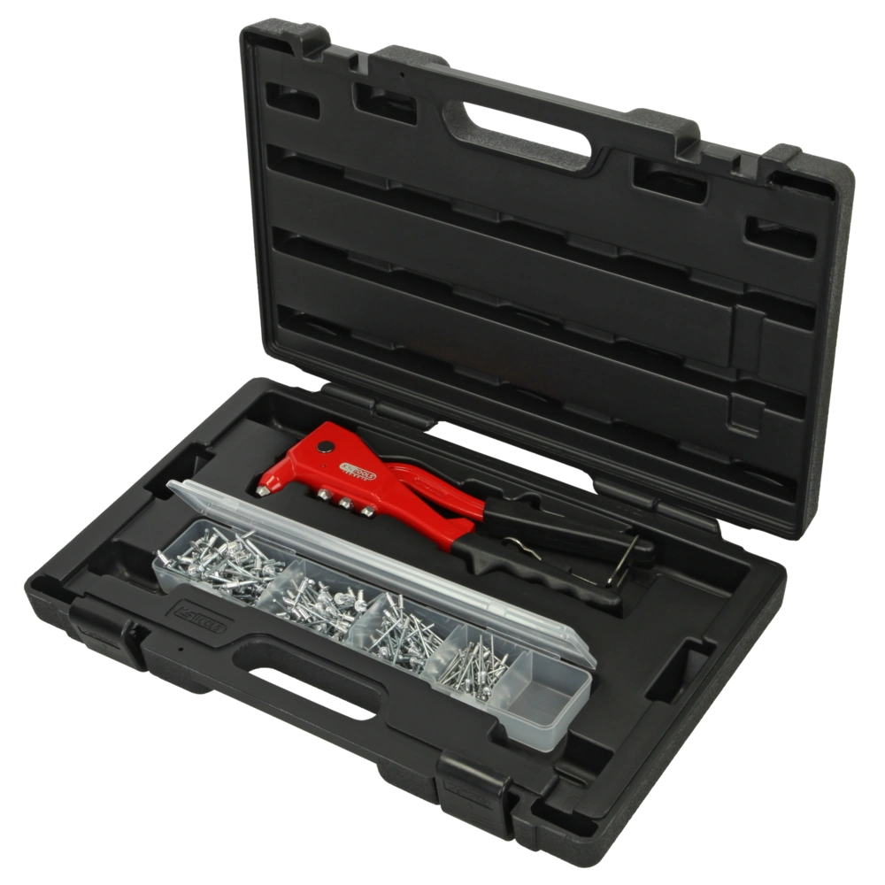 Il Set di rivetti a mano è contenuto in un robusta valigia in plastica. E' composta da diversi rivetti ciechi, un rivetto a mano con 4 bocchini intercambiabili e chiusura di sicurezza all'estremità dell'impugnatura...