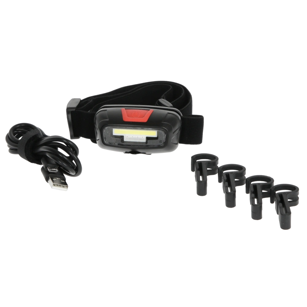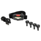 Lampada da testa a batteria ricaricabile, con fascio luminoso orientabile e corpo con protezione antipolvere e antischizzi. Sono disponibile due livelli di luminosità. Inoltre, la lampada frontale fornisce una luce rossa indicata per lavorare al buio, a luce fissa o lampeggiante. I clip a corredo consentono il fissaggio della lampada su un elmetto protettivo.