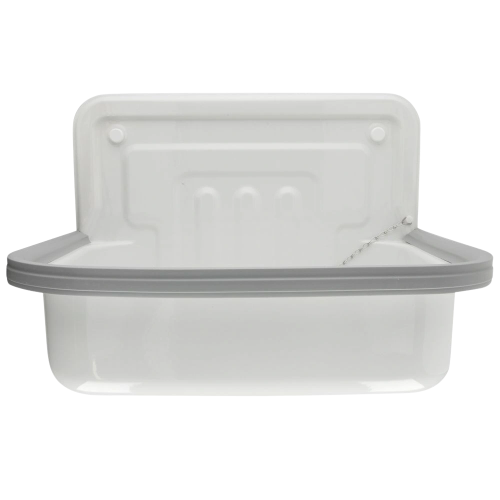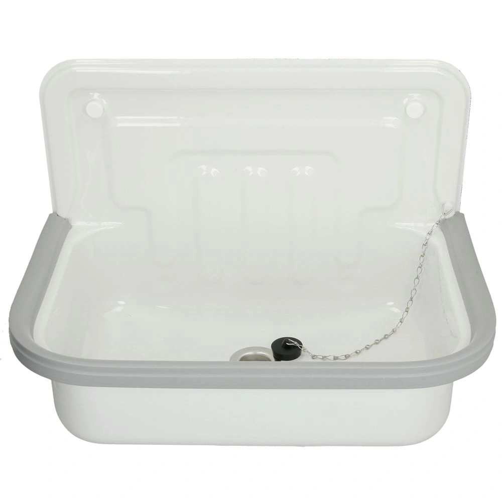 Il lavatoio senza foro rubinetto e troppopieno è glassato all'interno e all'esterno. Il bordo grigio è in plastica. Viene consegnato insieme a una catena e a un tappo.