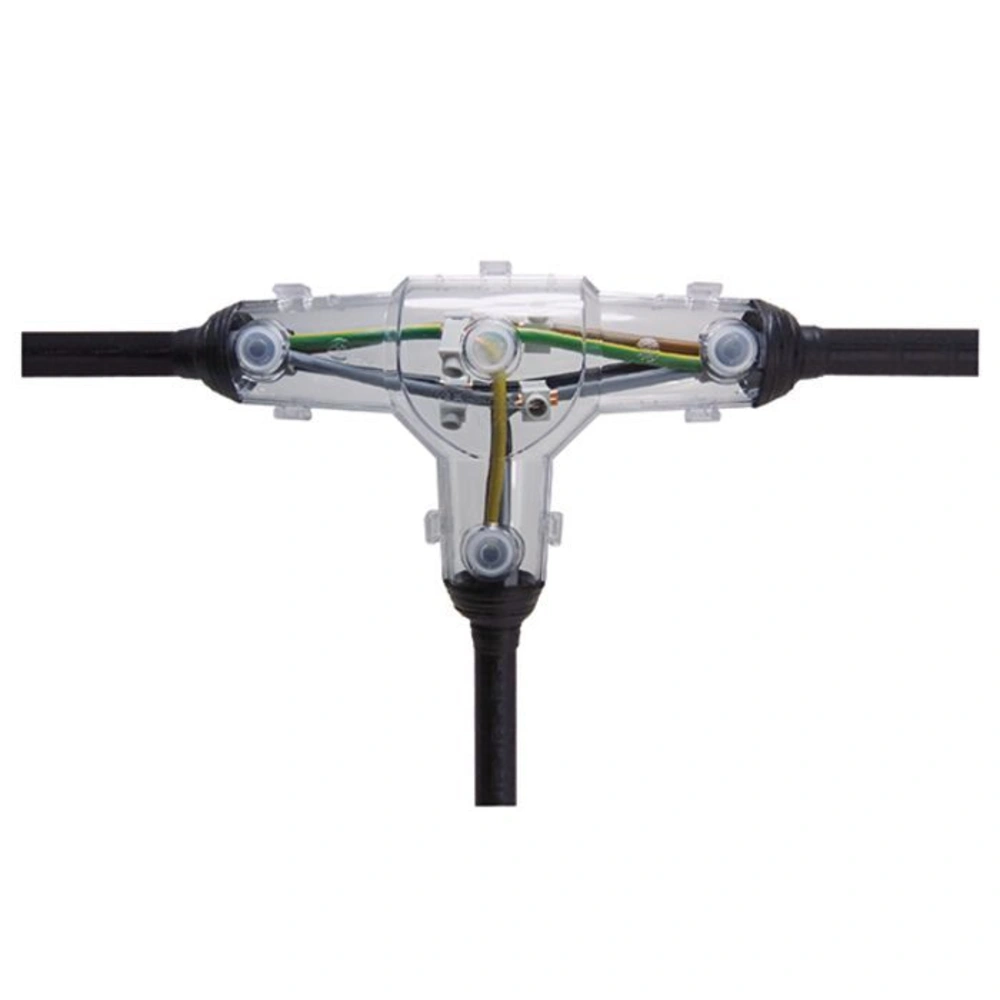 Manicotto di giunzione per il collegamento impermeabile di cavi con isolamento in PVC, PE, VPE ed EPR. È adatto a connettori a pressare e a vite per cavi in alluminio e rame. È compatibile per uso interno ed esterno e per la posa sottoterra o in acqua. Il manicotto è privo di alogeni, impermeabile e resistente alle sostanze chimiche, alle terre alcaline e ai raggi UV. L'alloggiamento trasparente, con un'ampia apertura per il riempimento con resina sigillante, è realizzato in plastica antiurto. La resina poliuretanica liquida bicomponente, che garantisce una maggiore resistenza all'idrolisi, è facile da lavorare e consente un utilizzo pulito.