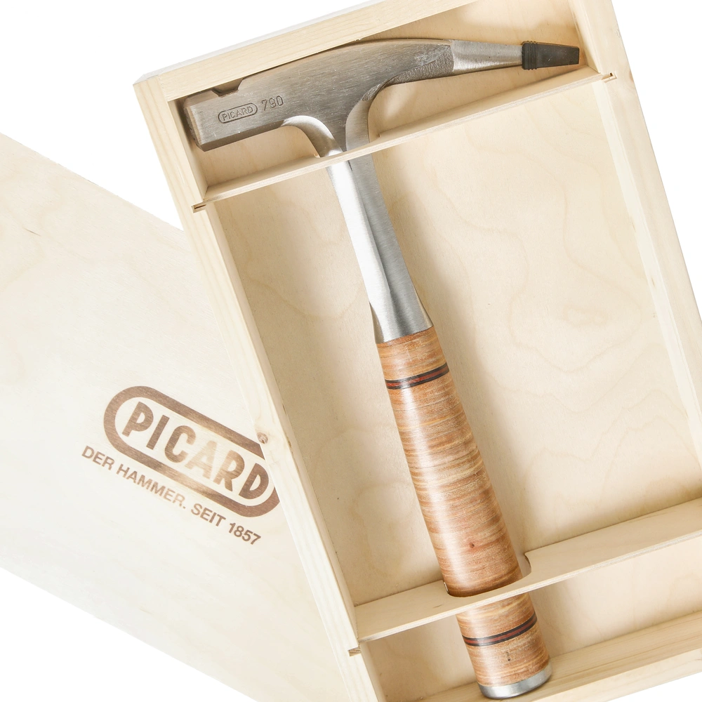 Martello da carpentiere interamente in acciaio con manico in cuoio. Un attrezzo indispensabile per la mano del maestro, con la massima potenza di impatto e bilanciato. La sua testa in acciaio speciale di alta qualità ha una superficie ruvida con incavi particolarmente profondi. Il porta chiodi integrato è magnetico - i chiodi penetrano infallibilmente nel legno. Con l'artiglio, anche i piccoli chiodi possono essere afferrati in modo sicuro. La punta sottile è rivestita di una protezione in gomma. L'impugnatura estremamente resistente all'usura è composta da strati di piastre di pelle resistenti alla torsione. Offre una presa confortevole e assorbe l'umidità, che rilascia nuovamente al termine del lavoro. La pelle liscia e levigata si adatta all'ergonomia della mano nel tempo. Il nobile strumento è consegnato in una scatola di legno abbinata.